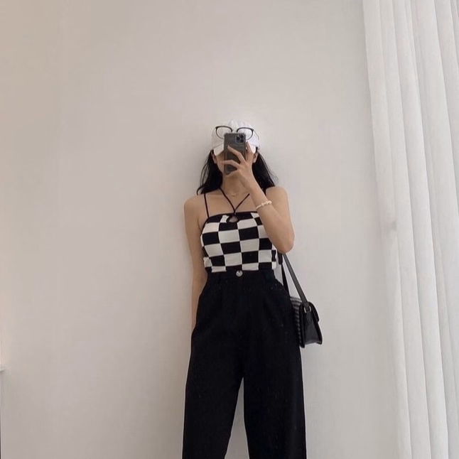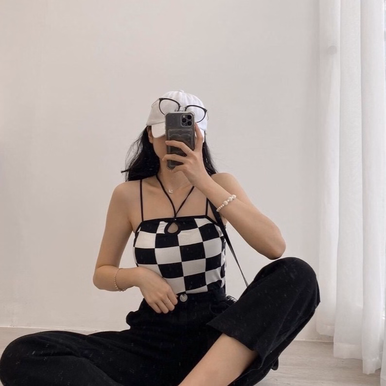 Áo 2 Dây Dáng Croptop Kẻ Ô Caro Phối Dây Cổ – Diepchi Fashion