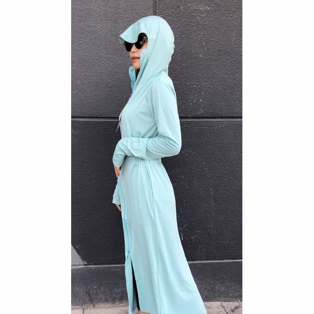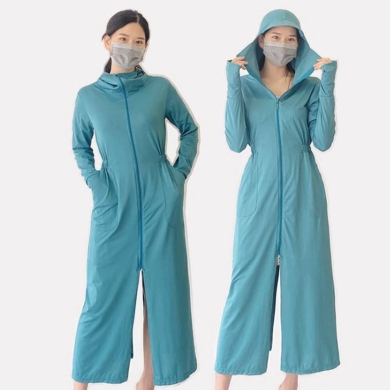 Thiết kế tay áo dài, có mũ trùm đầu làm giảm thiểu tối đa tác hại của ánh nắng mặt trời.