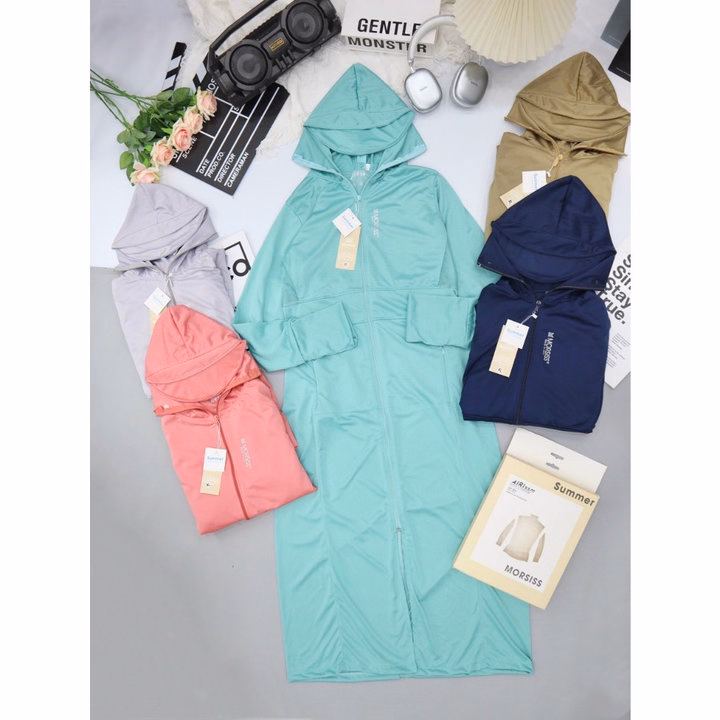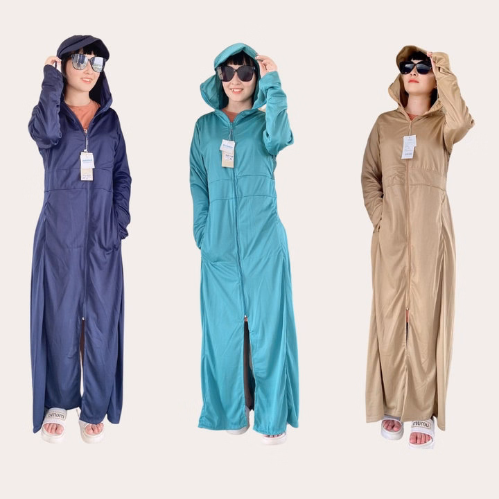 – Aó với thiết kế dáng dài với phần mũ cứng trùm đầu, tay áo dài che kín bàn tay giúp bảo vệ làn da dưới tác hại của ánh nắng mặt trời. Thiết kế 2 lớp dày dặn, đường may tỉ mỉ, chắc chắn là điểm cộng của chiếc áo này
