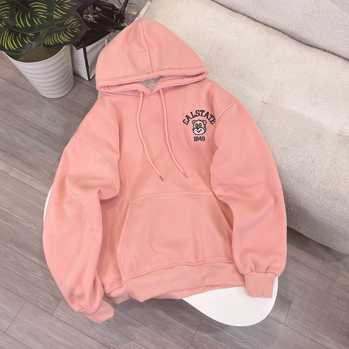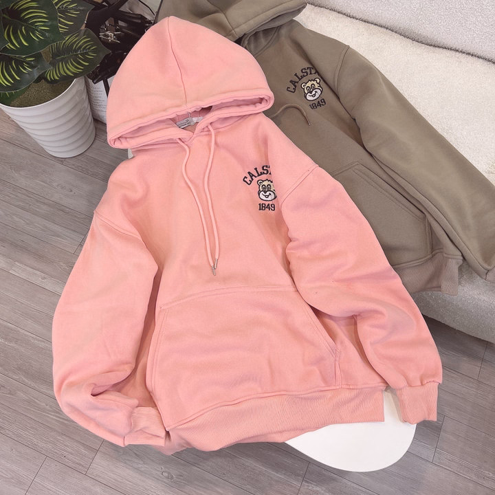 Chất liệu nỉ bông dày dặn, mềm mịn, ấm áp cực thích hợp cho thời tiết thu đông hoặc mặc trong văn phòng/môi trường lạnh. Điểm nhấn là họa tiết gấu hoạt hình thêu sắc nét kèm chữ Calstate 1849, tạo phong cách vừa dễ thương vừa trẻ trung.