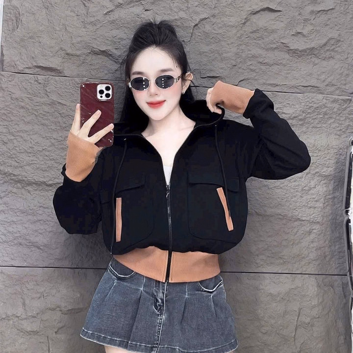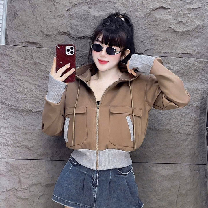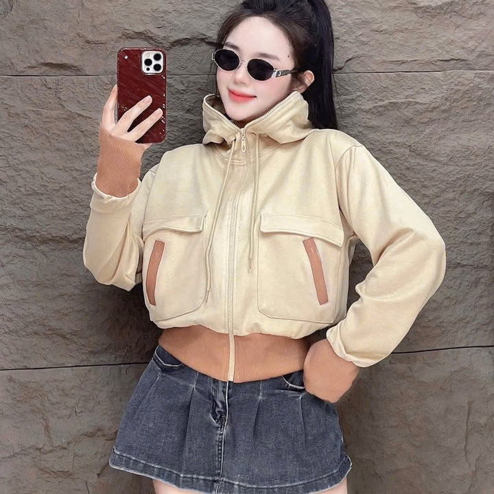 Áo Khóa Nữ Croptop Túi Hộp Chất Nỉ Pc Mịn Nón To 2 Lớp – Htm Fashion