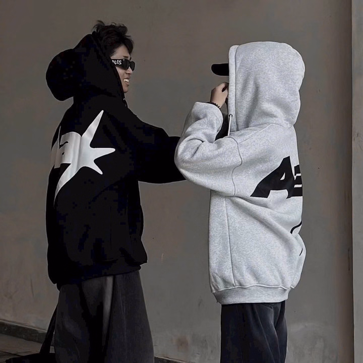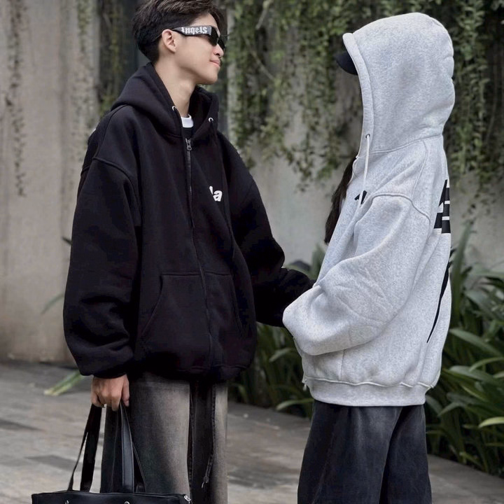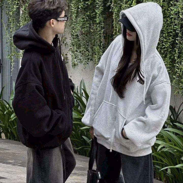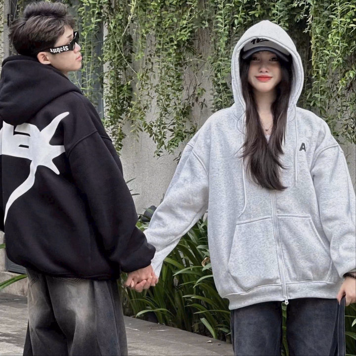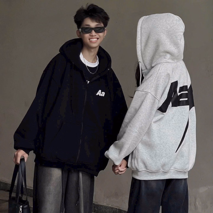 Áo Khoác Cặp Đôi Nam Nữ Có Nón Form Rộng Phối Khóa Kéo 2 Đầu In Chữ Aa -Htm Fashion