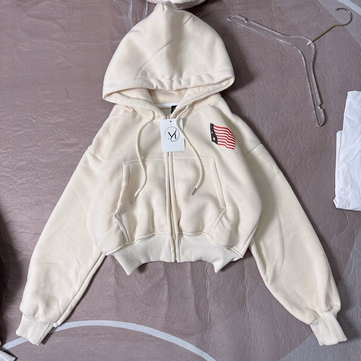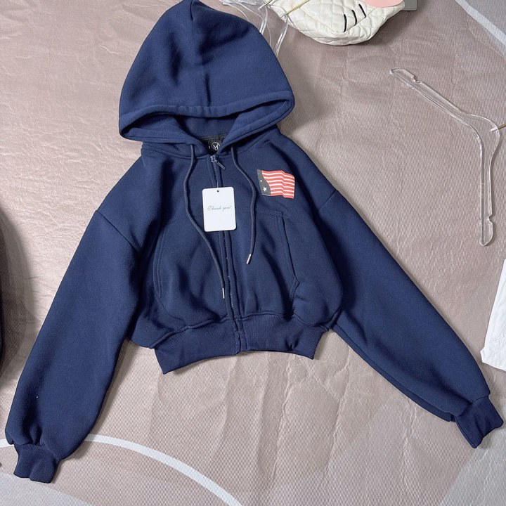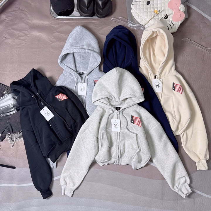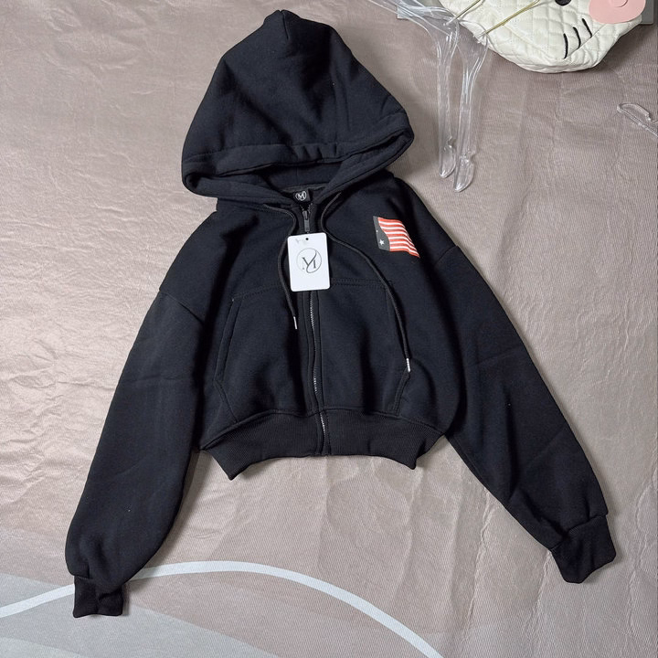 Áo Khoác Croptop Nỉ Nữ Dáng Lửng In Lá Cờ 2 Mặt Trước Sau Có Nón Chống Nắng – Htm Fashion