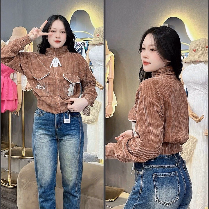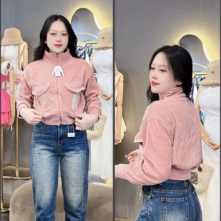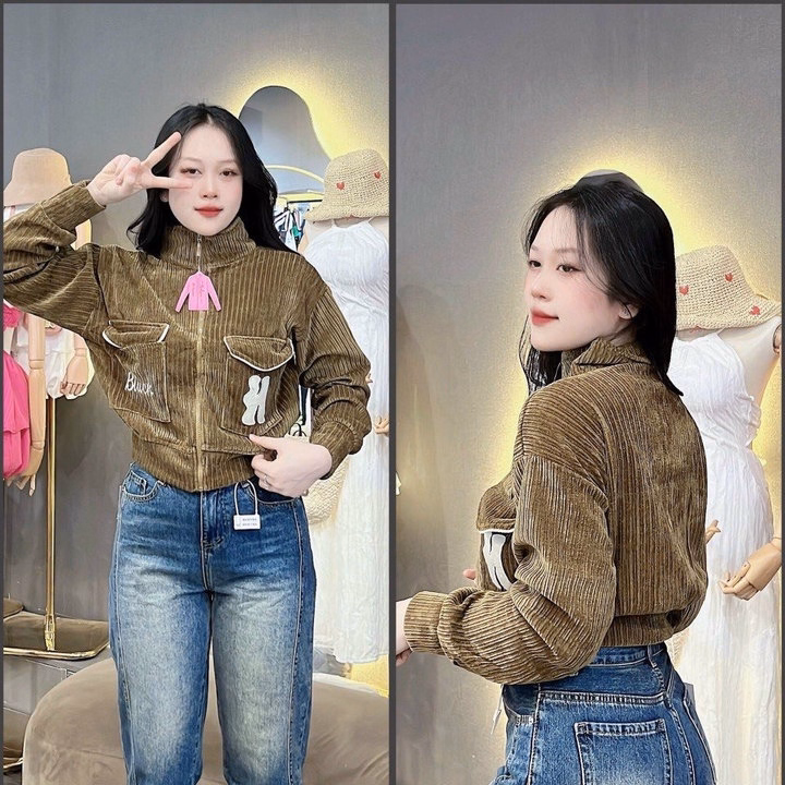 Áo Khoác Croptop Nữ Nhung Gân Cổ Đứng Thêu Bluck Phối 2 Túi Trước Áo -Htm Fashion