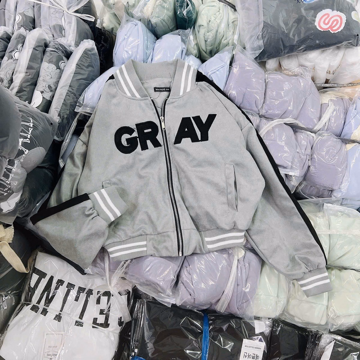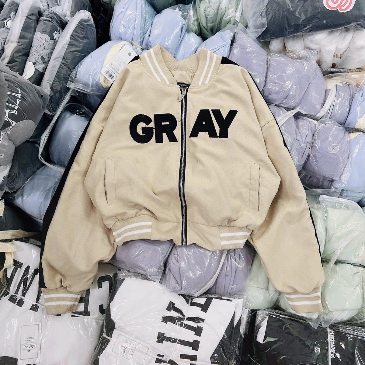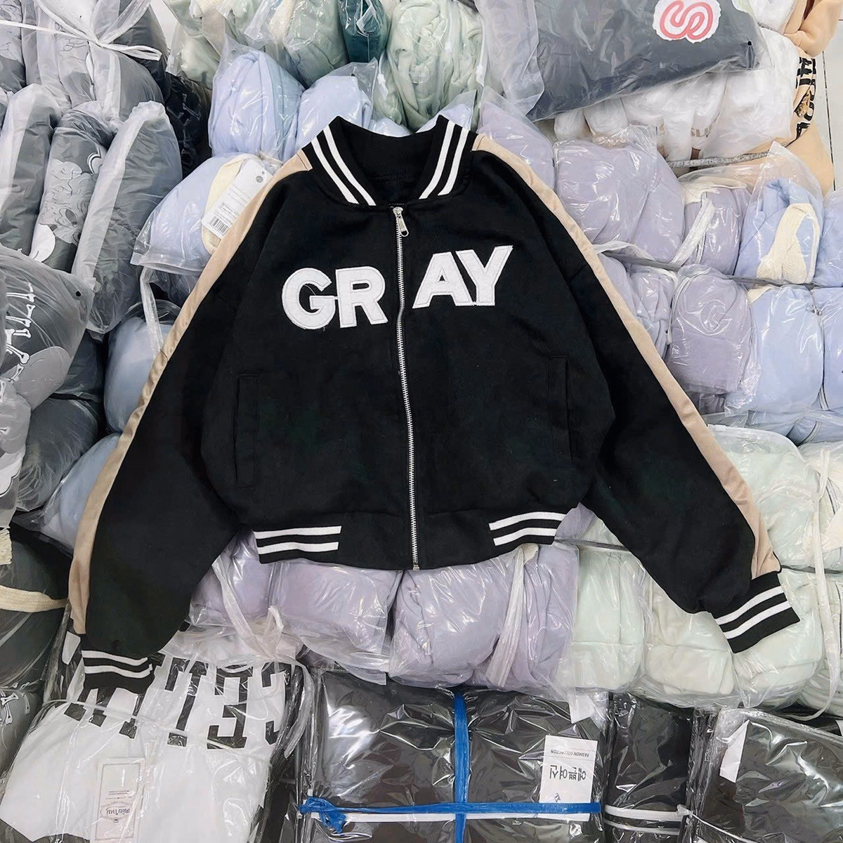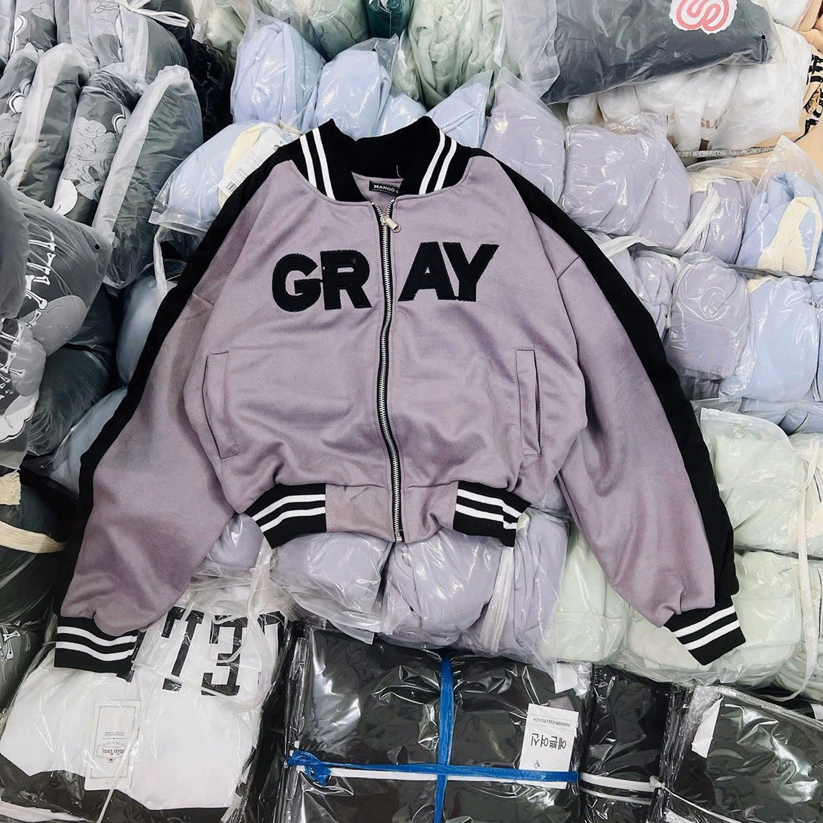 Áo Khoác Da Lộn 2 Lớp Nữ Với Chất Dáng Form Kiểu Lửng Thêu Nổi Chữ Gray Có Viền Bo Chun Siêu Xịn Phối Sọc Cánh Tay Hàng Hot Trend-Htm Fashion