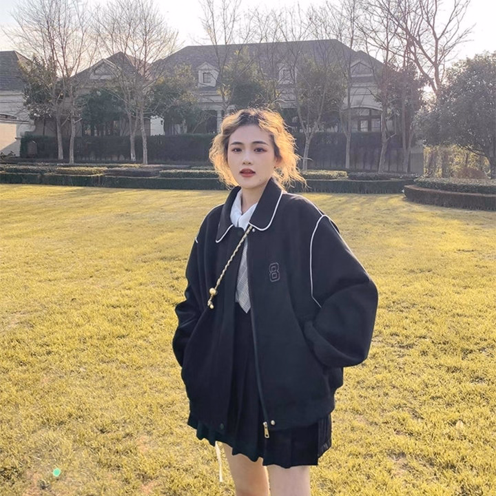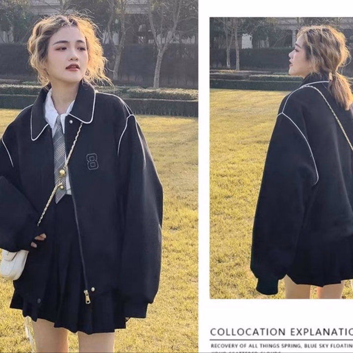 Áo Khoác Da Lộn Nữ Cổ Bẻ Họa Tiết Số 8 Thiết Kế Khóa Kéo Kèm Nút Bấm – Htm Fashion