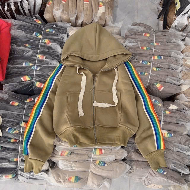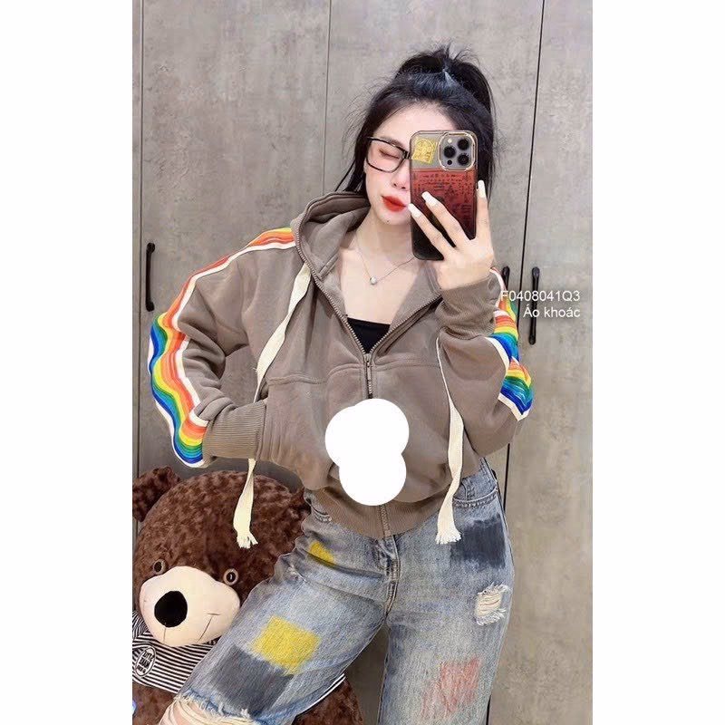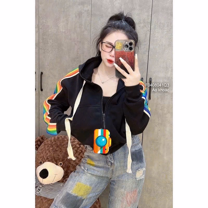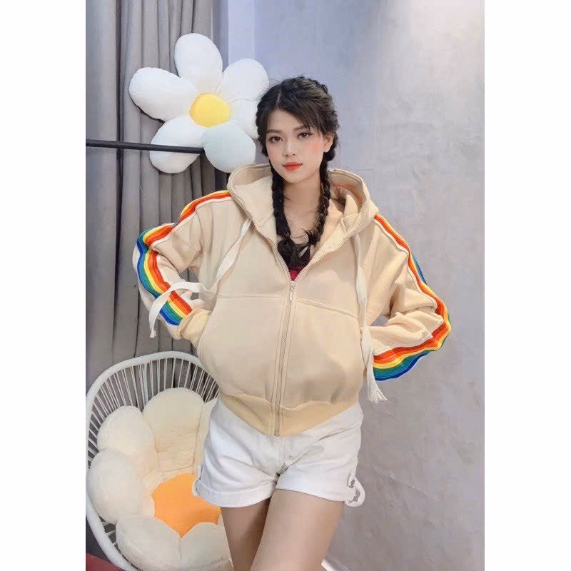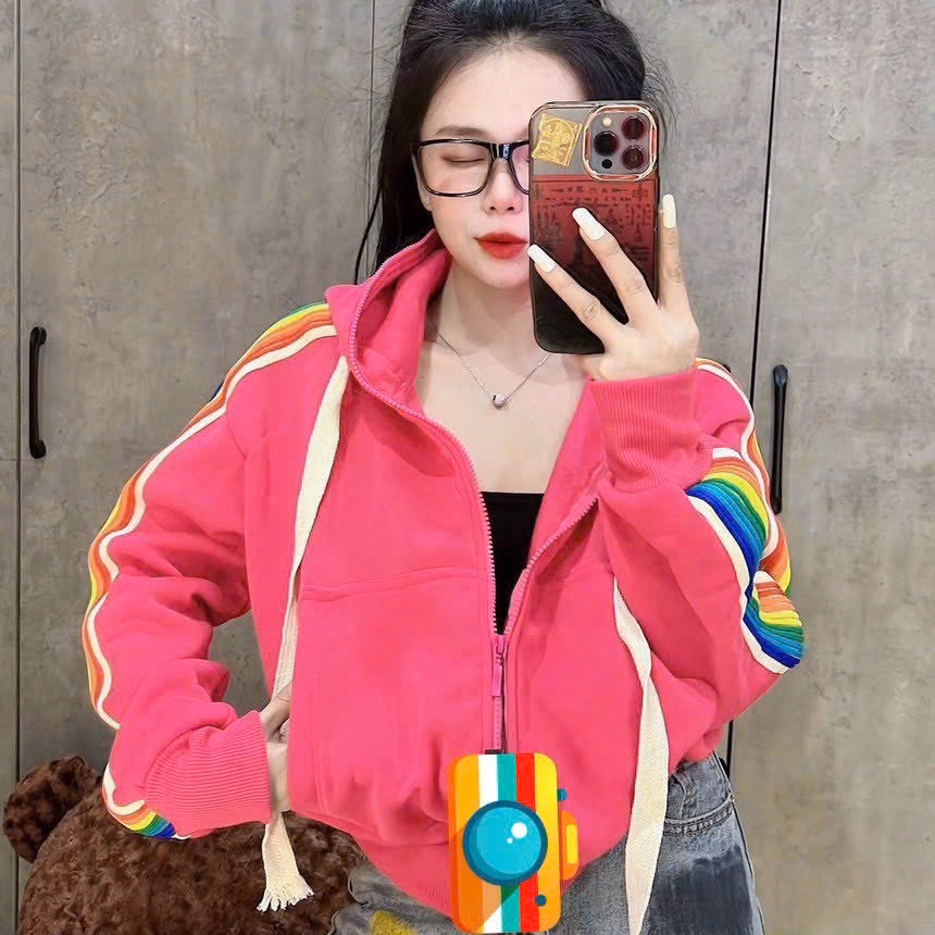 Áo Khoác Dáng Lửng Dày Dặn Nữ Phối Sọc Cầu Vòng Kèm Túi Xỏ Ngón Siêu Đẹp Form Rộng Cá Tính Hàng Hot Trend-Htm Fashion