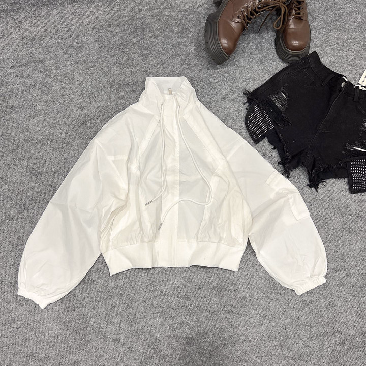 Áo Khoác Dù Gió Nhăn Croptop Nữ Thiết Kế Khóa Kéo Ở Tay – Htm Fashion