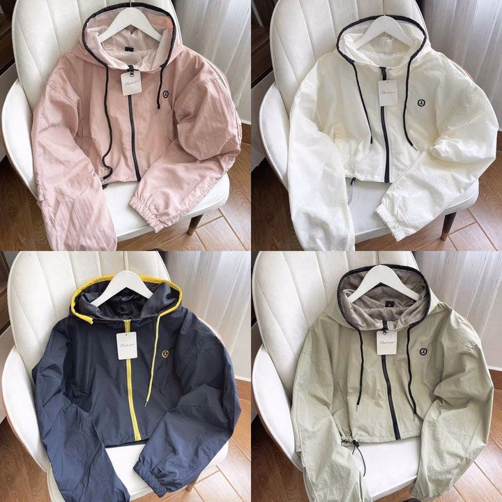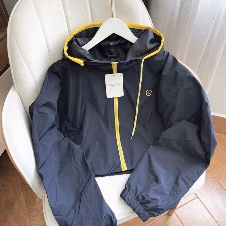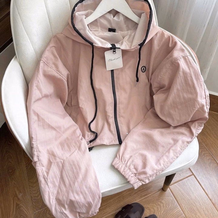 Áo Khoác Dù Gió Nhăn Nữ Croptop Có Nón Họa Tiết In Dấu Ở Ngực – Htm Fashion