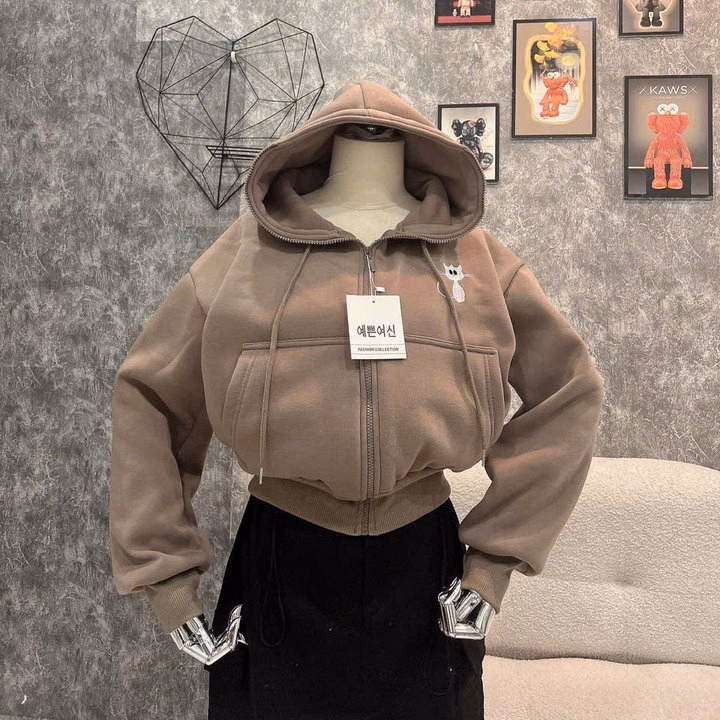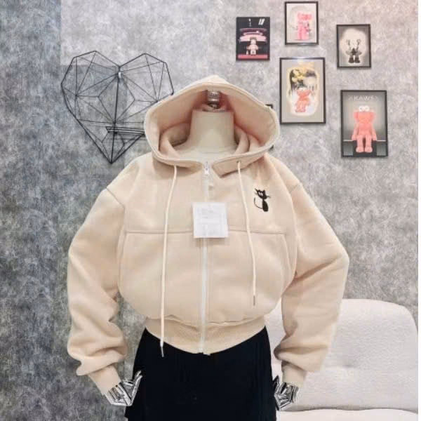 Tên sản phẩm: Áo Khoác Form Lửng Nữ Vải Nỉ Nón Rộng 2 Lớp Thêu Hình Mèo Con Tp50 – Golden Dream