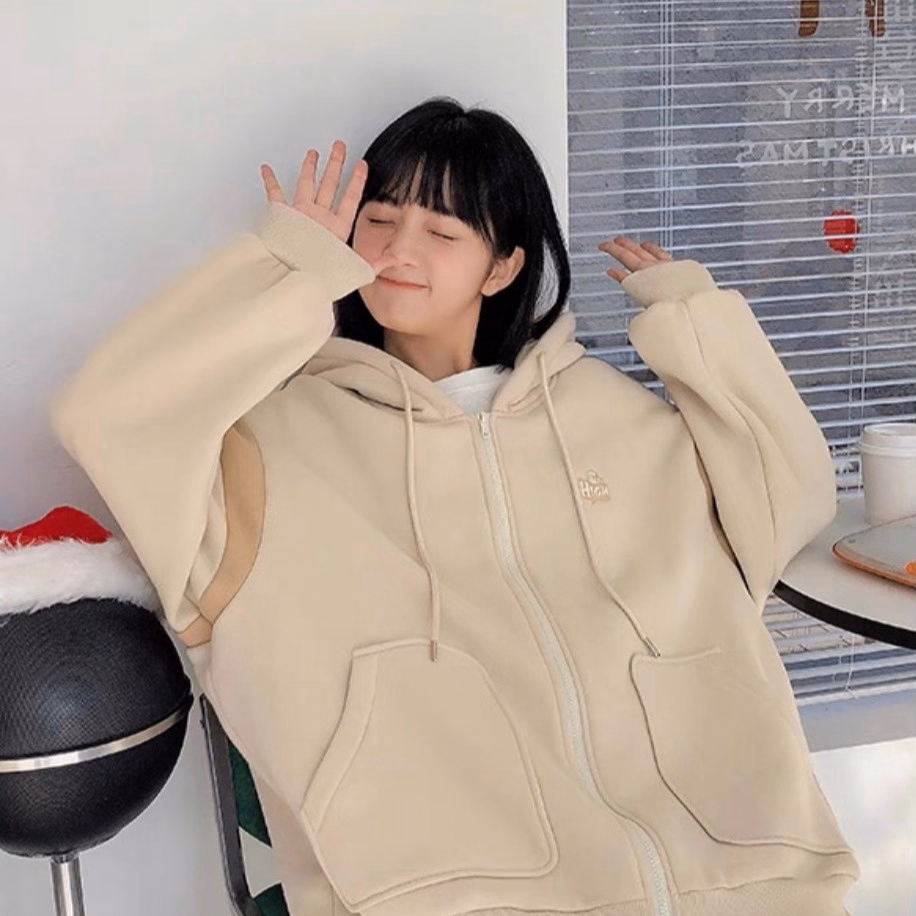 Áo Khoác Hoodie Dây Kéo Có Nón Thêu High Phối Sọc Tay Thể Thao Phong Cách Dáng Rộng Hàn Quốc