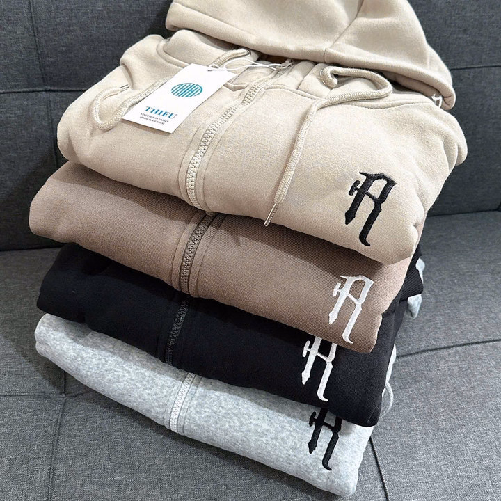 Chi tiết: Có mũ kèm dây rút, khóa kéo zip tiện lợi, logo chữ cách điệu trước ngực tạo điểm nhấn tinh tế.