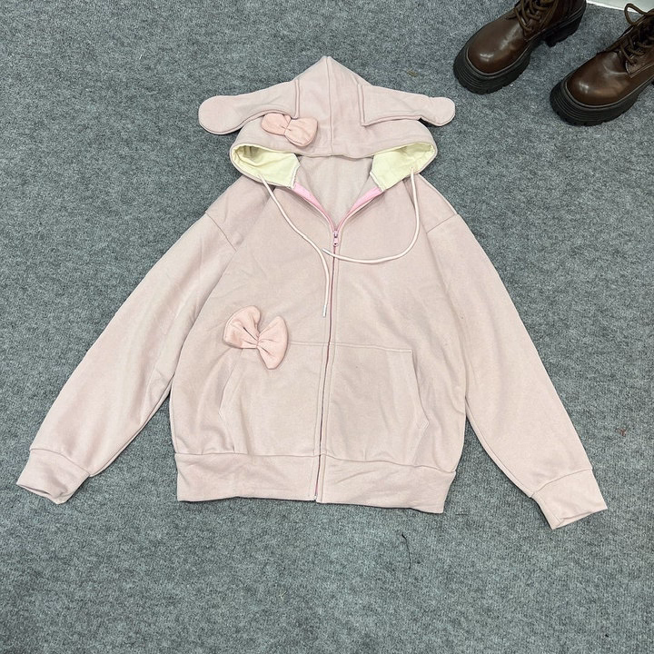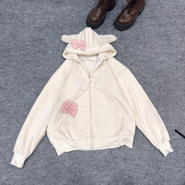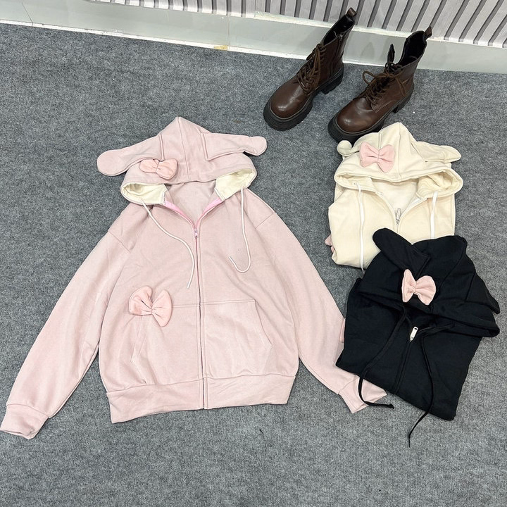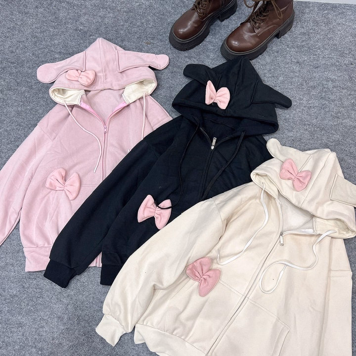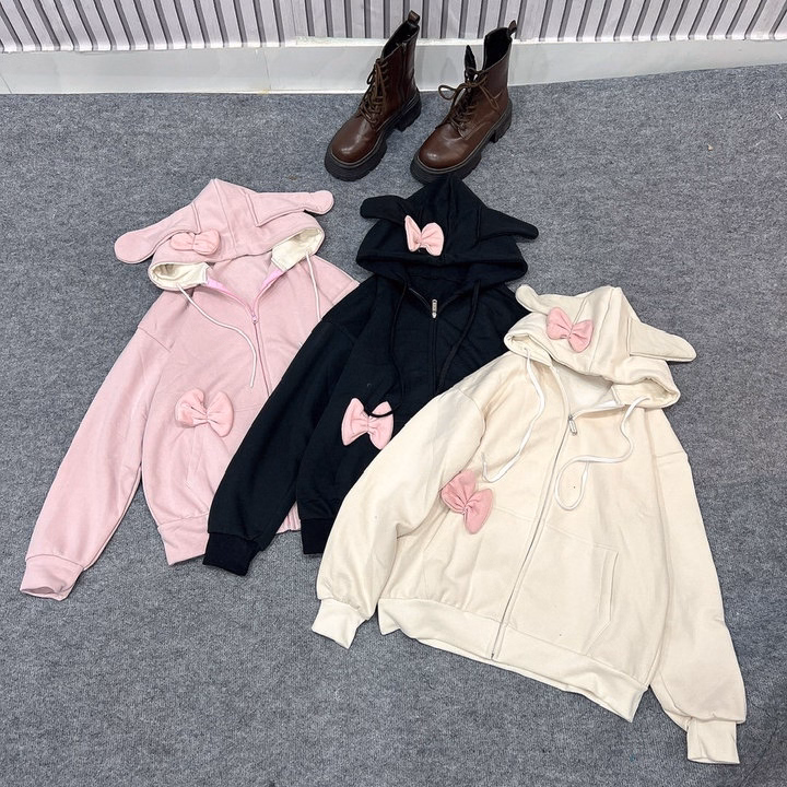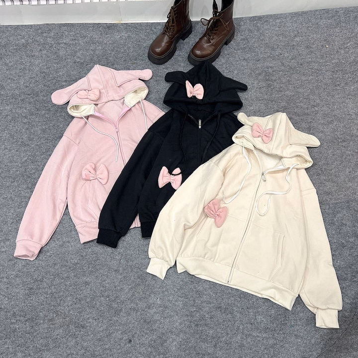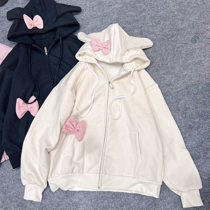 Áo Khoác Hoodie Nỉ Nữ Phối Khóa Kéo Thiết Kế Nơ Tai Thỏ – Htm Fashion