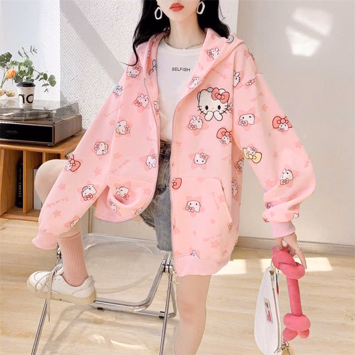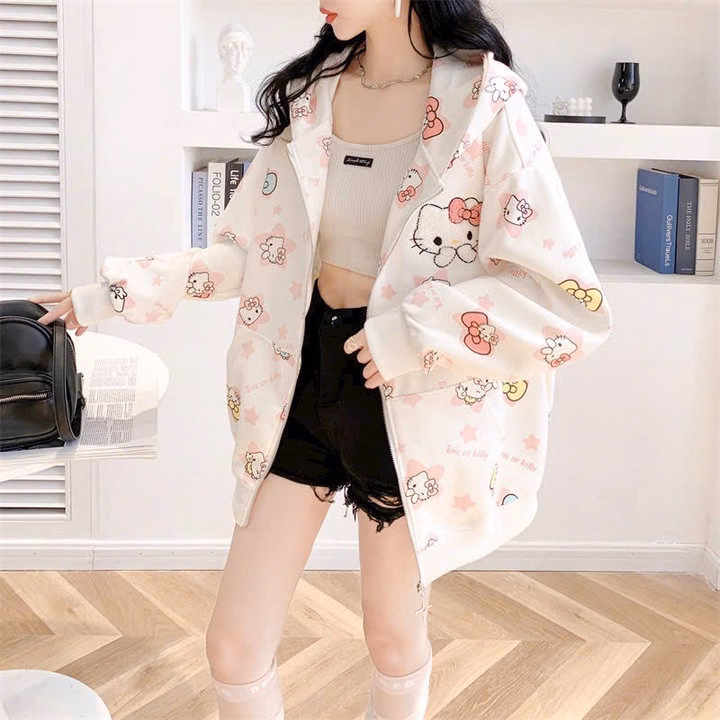 Áo Khoác Hoodie Nữ In 3D Mèo Kitty Dễ Thương Có Nón Chống Nắng -Htm Fashion