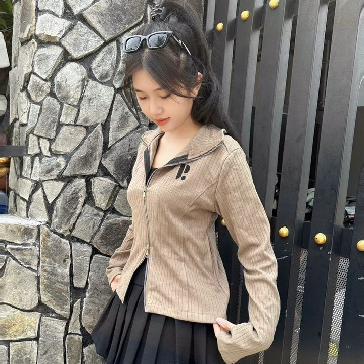 Áo Khoác Len Gân Nữ Cổ Bẻ Form Ôm Body Họa Tiết Thêu Chữ Thiết Kế Khóa 2 Chiều -Htm Fashion