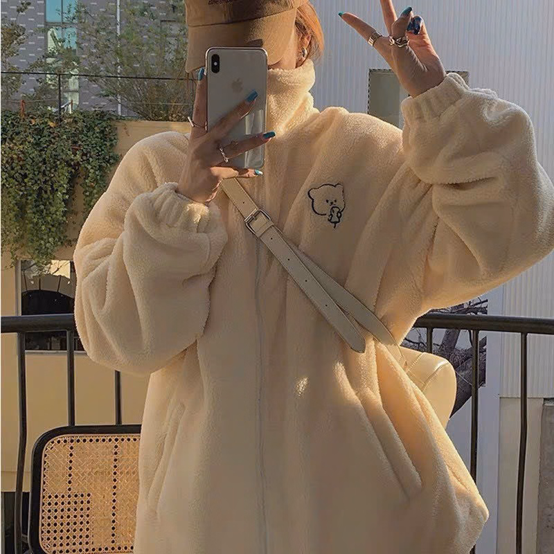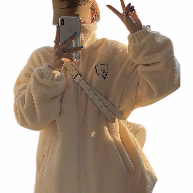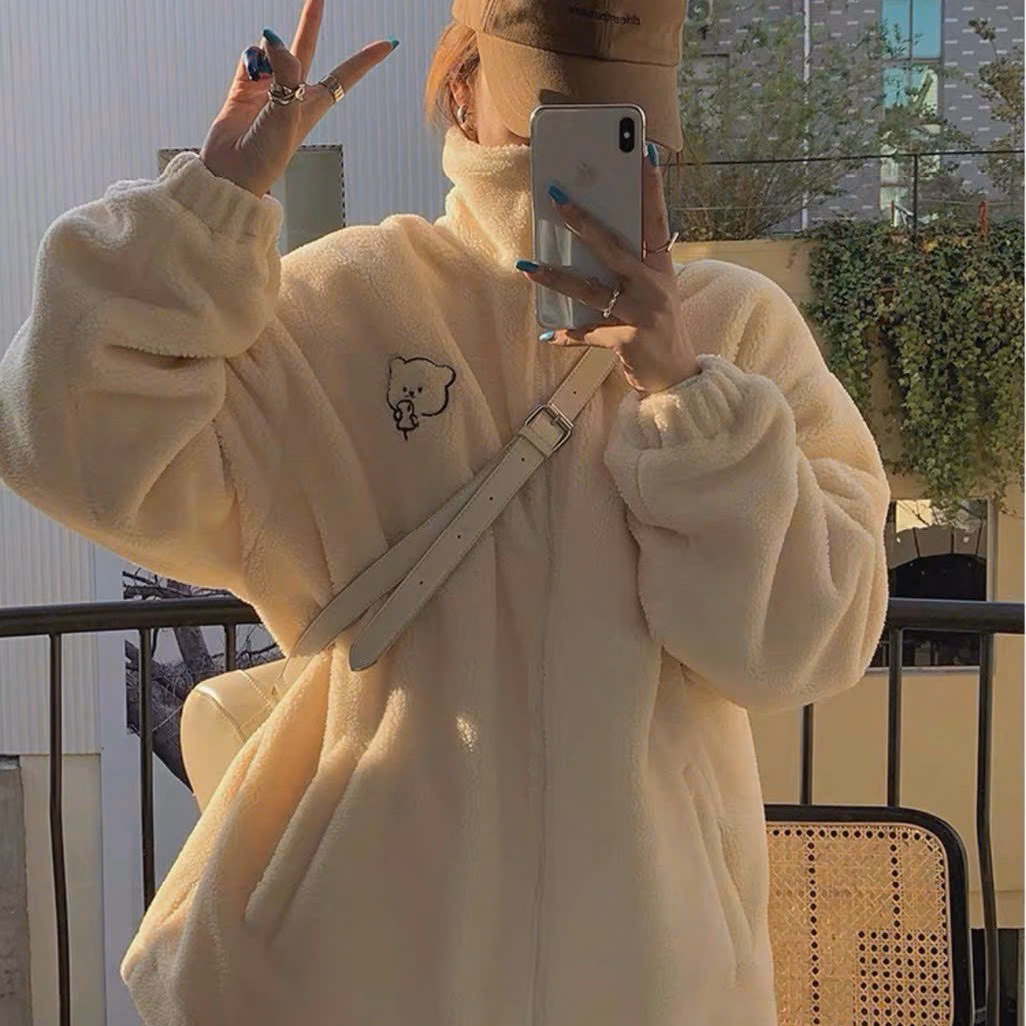 Áo Khoác Lông 2 Lớp Phối Kiểu Dáng Cao Có In Bé Gấu Dễ Thương Chất Vải Dày Dặn Fdorm Rộng Hàng Hot Trend-Htm Fashion