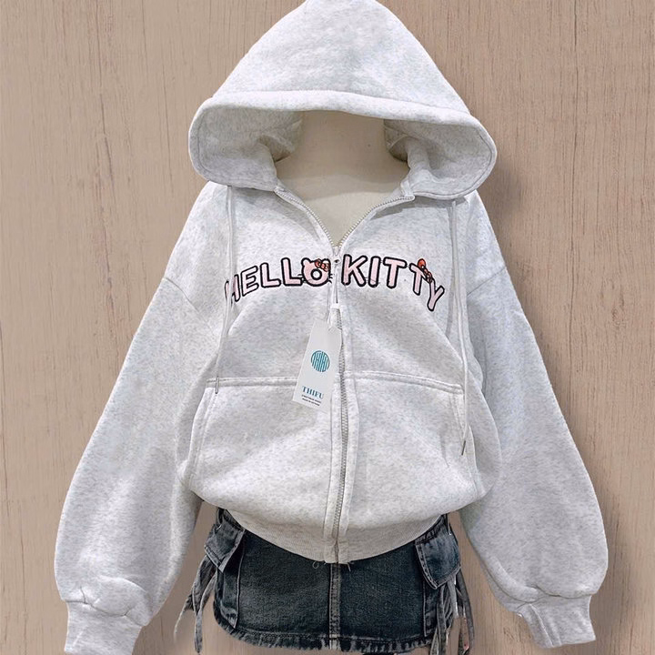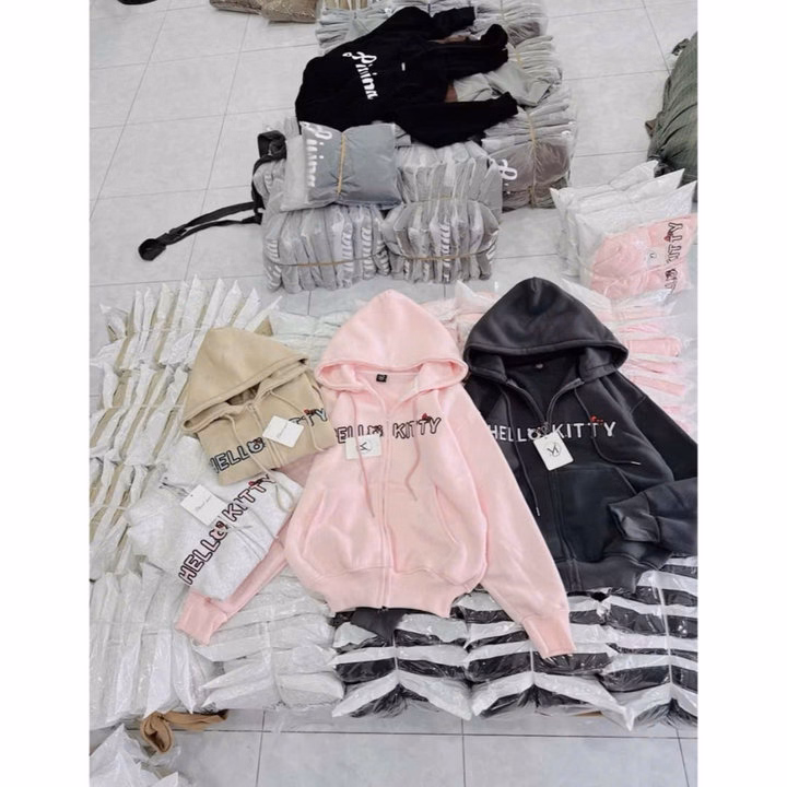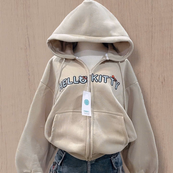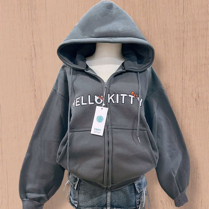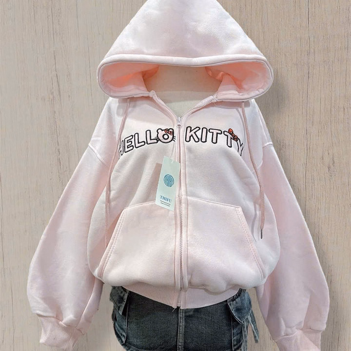 Áo Khoác Lửng Croptop Nỉ Dệt Xk Dày Thêu Hello Kitty Có Nón Unisex Khoá Zip Chống Nắng T952