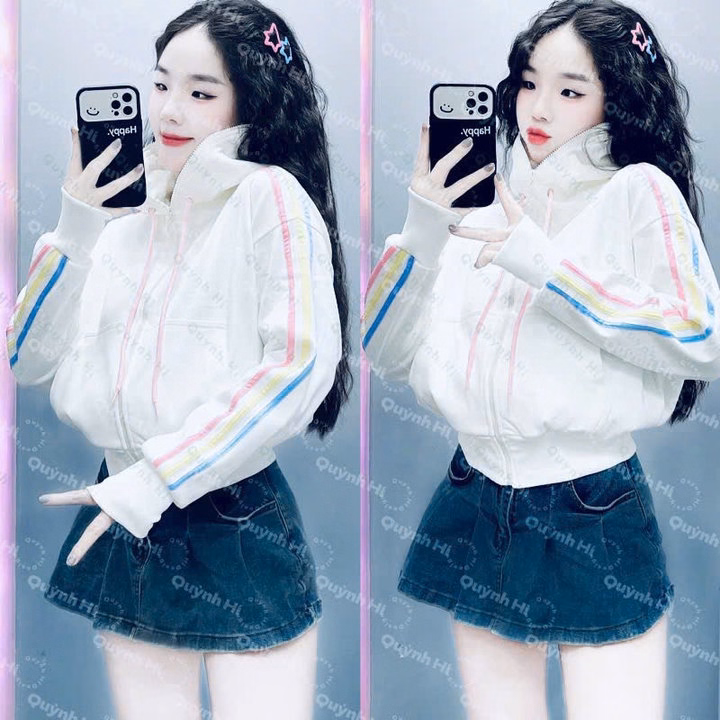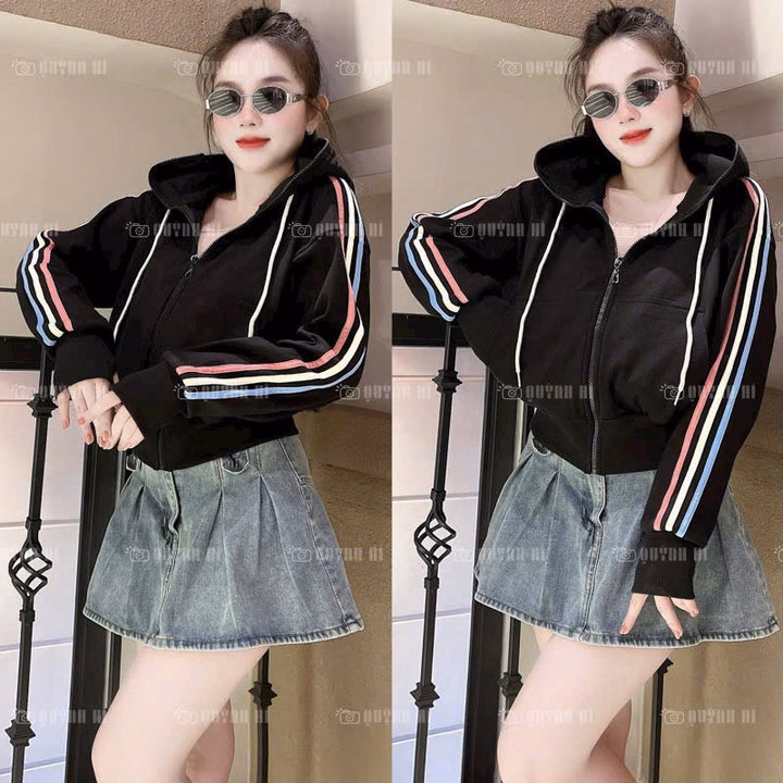 Tên sản phẩm: Áo Khoác Lửng Nữ Vải Nỉ Phối 3 Sọc Tới Mũ Tay Xỏ Ngón Có Túi Trong Ut33 – Golden Dream