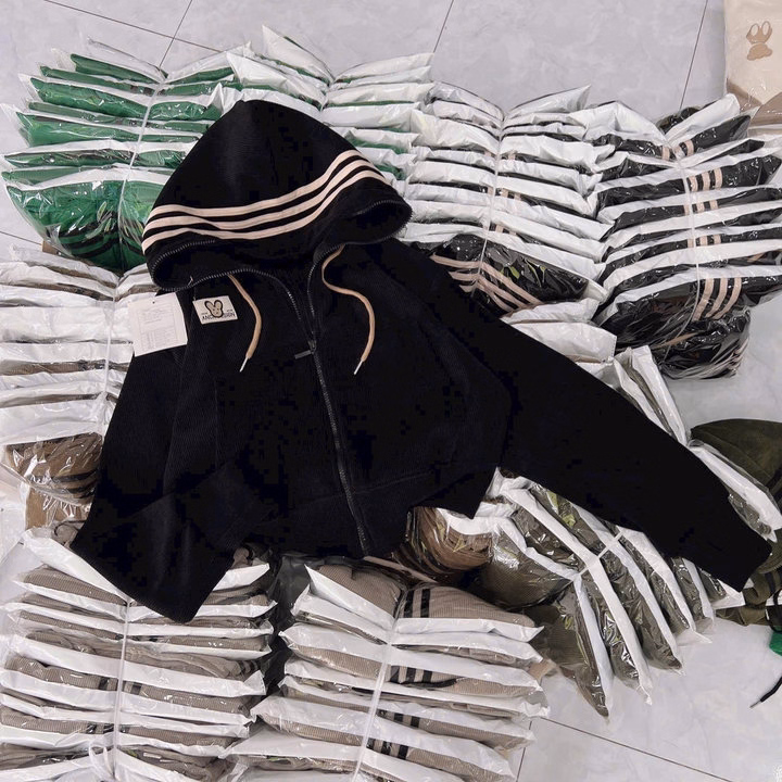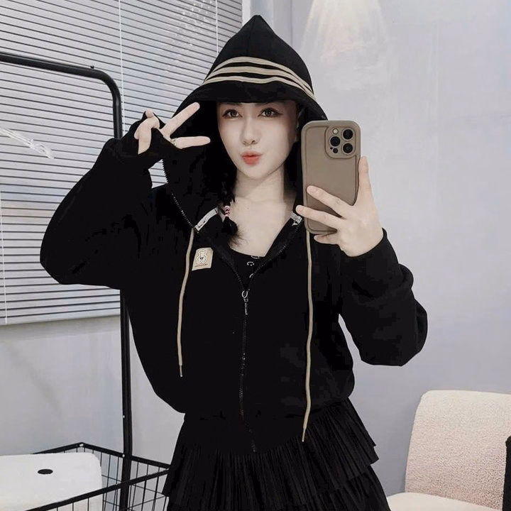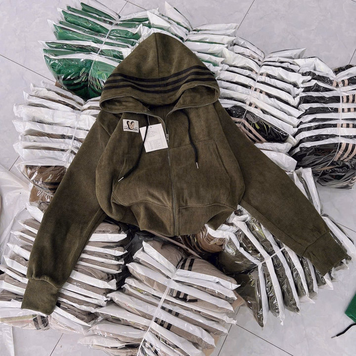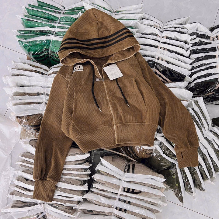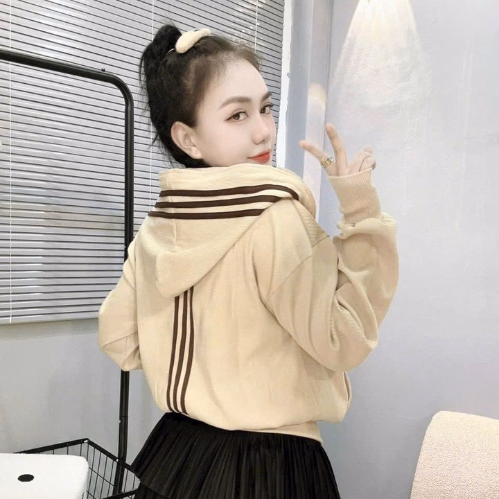 Áo Khoác Nhung Tăm Nữ Croptop Phối 3 Sọc Nón Và Lưng Như Hình -Htm Fashion