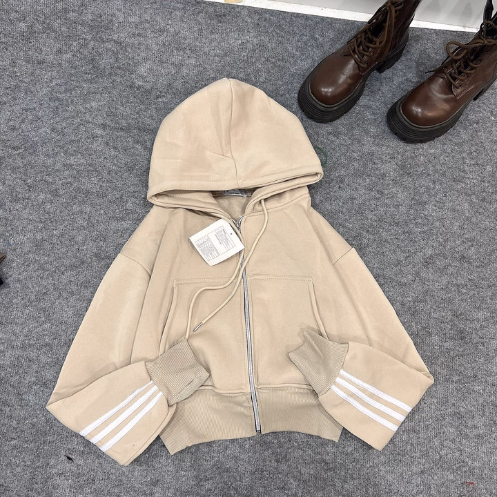 Chiếc áo khoác nỉ có mũ form croptop mang phong cách thể thao năng động với thiết kế phối sọc tinh tế ở tay và vai. Chất liệu nỉ dày dặn, mềm mại, giữ ấm tốt nhưng vẫn thoáng khí, phù hợp cho cả thời tiết se lạnh hoặc dùng làm item phối layer mùa thu – đông.