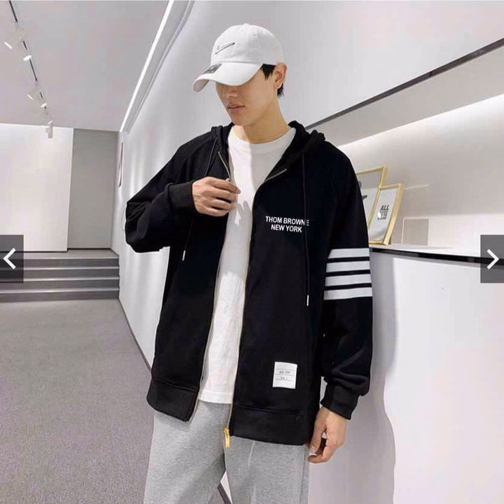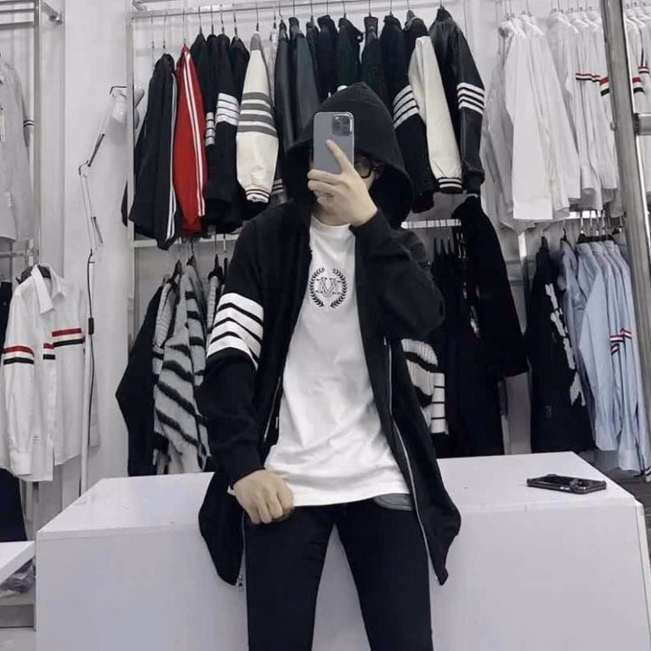 ▪️Thiết kế: Bo chun ống, khoá zip kéo, dập chữ ngực, thêu logo thom browne túi, tay dập 4 sọc kẻ