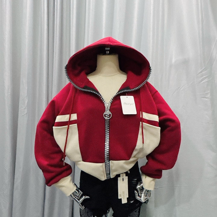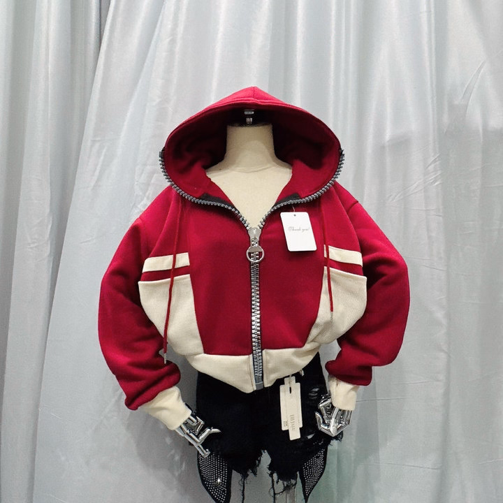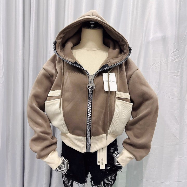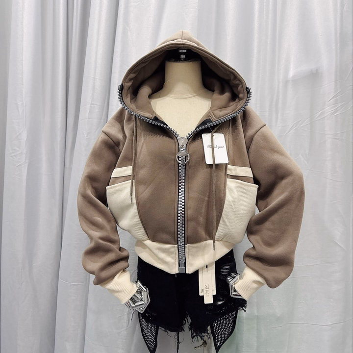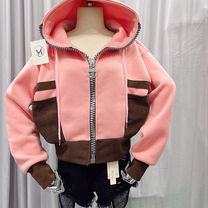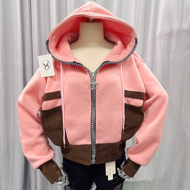 Áo Khoác Hoodie Nữ Croptop Phối Màu Hồng Nâu – Phong Cách Streetwear Cá Tính, Chất Nỉ Dày Cực Mịn