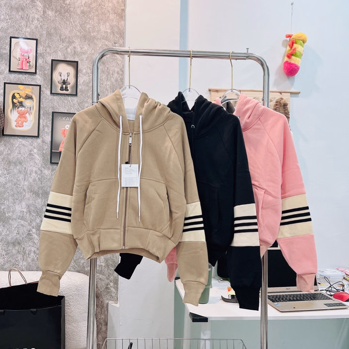 Áo Khoác Nỉ Nữ Croptop Có Nón Thiết Kế 3 Sọc Ngang Ở Tay – Htm Fashion