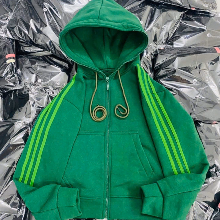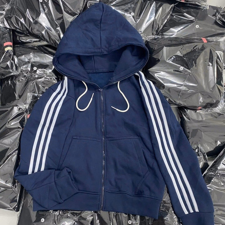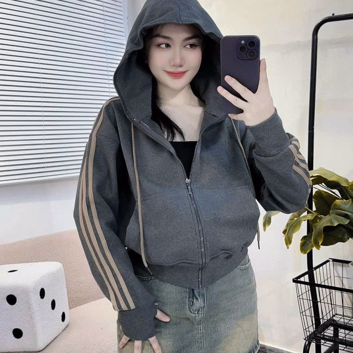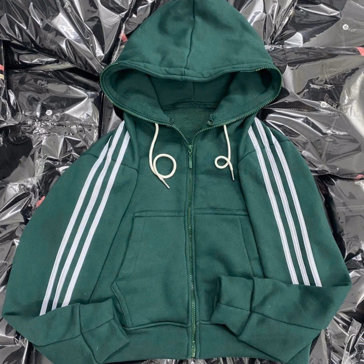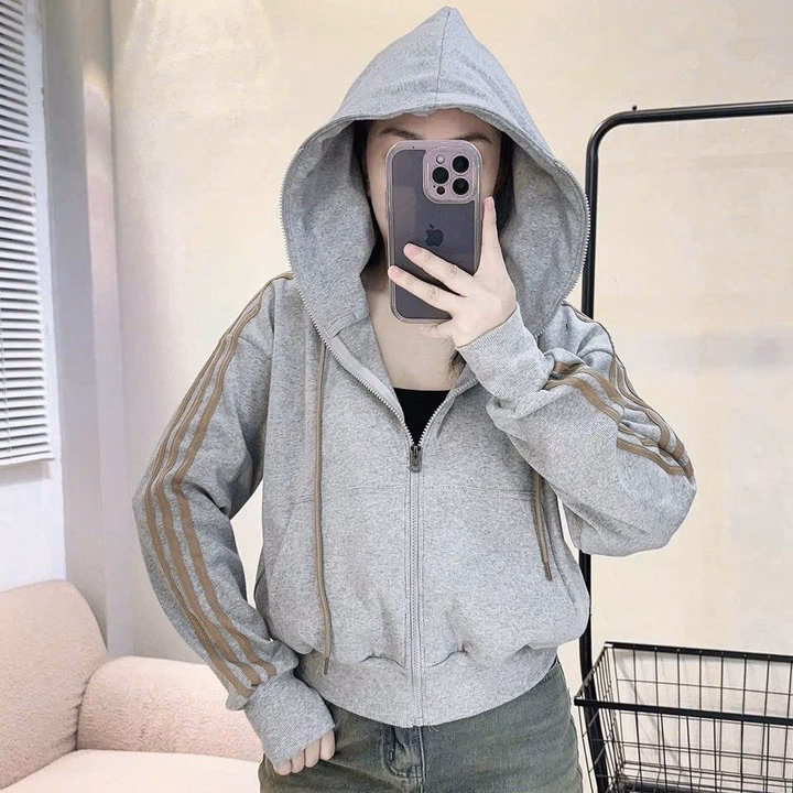 Áo Khoác Nỉ Nữ Croptop Dáng Lửng Phối Khóa Kéo Full Nón Có Túi Trong Thiết Kế Tay 3 Sọc -Htm Fashion