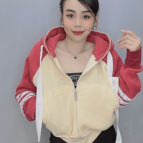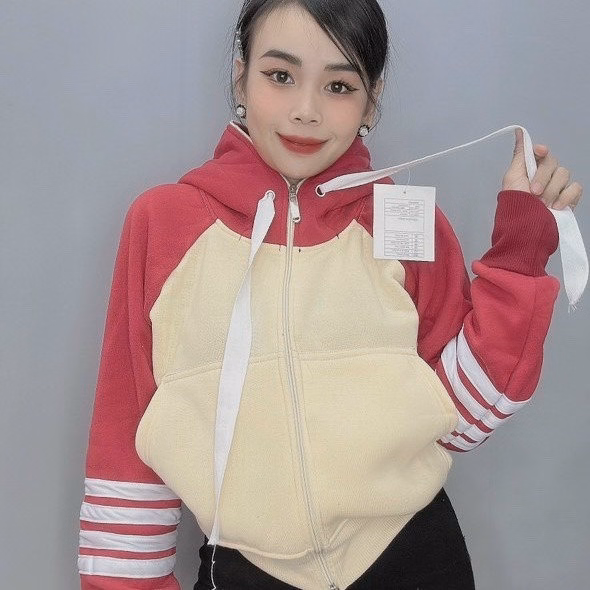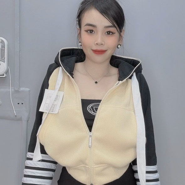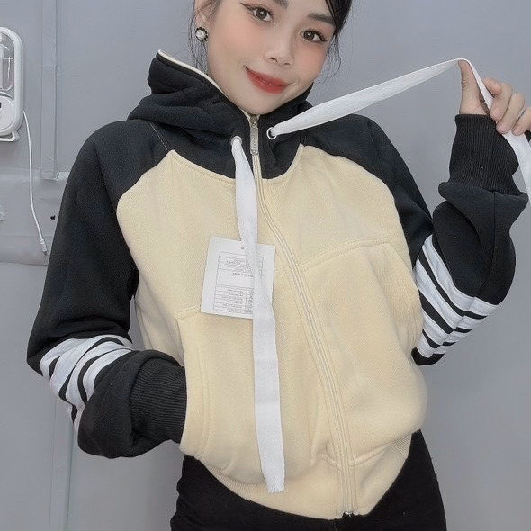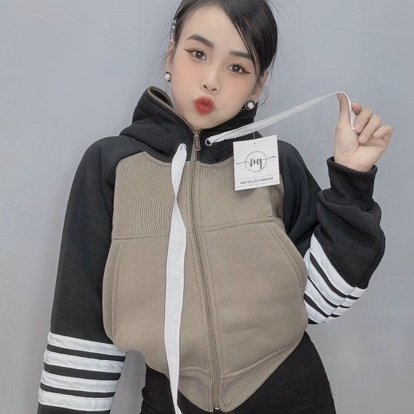 Áo Khoác Nỉ Nữ Crotop Form Rộng Phối Tay 4 Sọc Ngang Có Nón -Htm Fashion