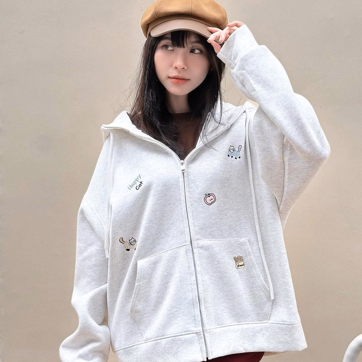 🧸 Áo Hoodie Nỉ Zip Form Rộng Thêu Họa Tiết Mèo – Dễ Thương, Ấm Áp, Phong Cách Hàn Quốc