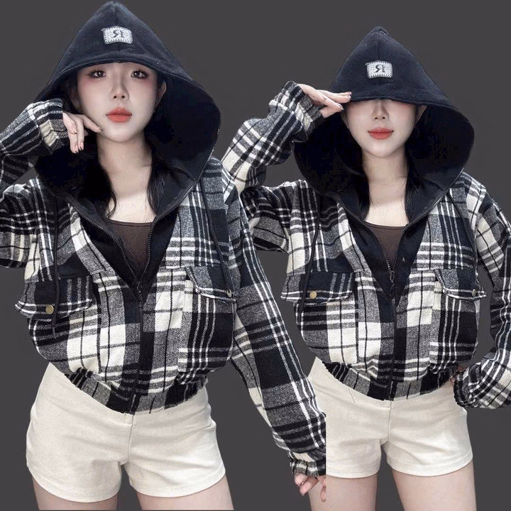 Áo Khoác Nữ Form Lửng Vải Caro Bố Nỉ Thêu Logo Mũ Rộng Siêu Đẹp Ut28 – Phương Store