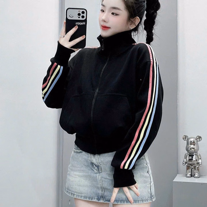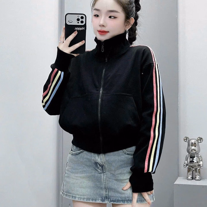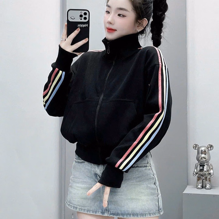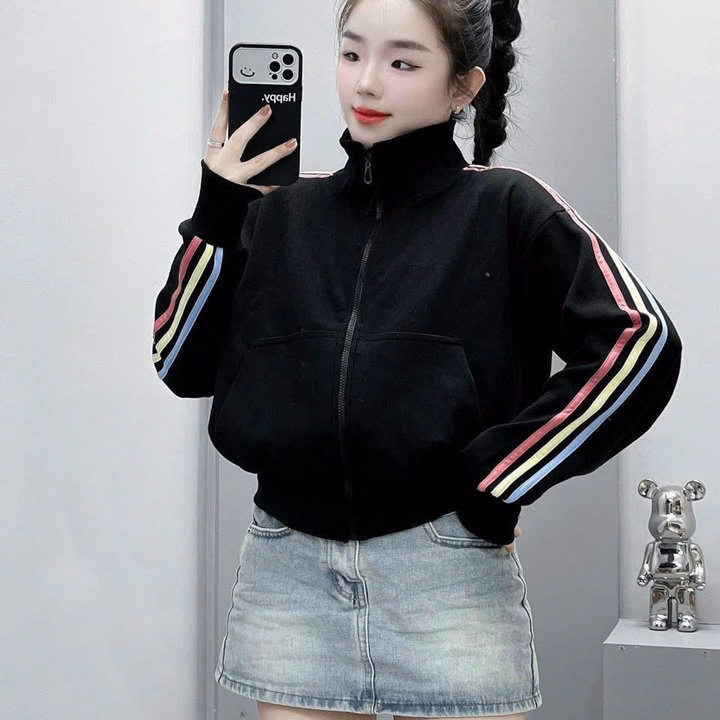Áo Khoác Nữ Form Lửng Vải Nỉ Ngoại Phối Sọc Tay Cầu Vồng Có Túi Trong Ut65 – Phương Store