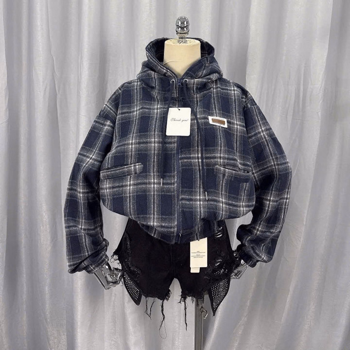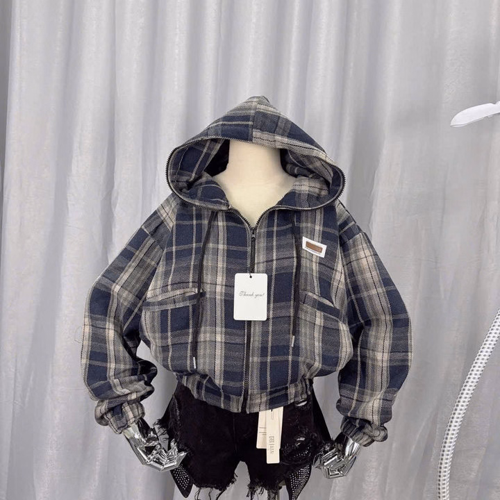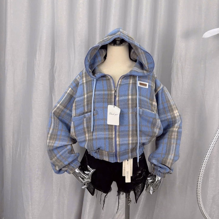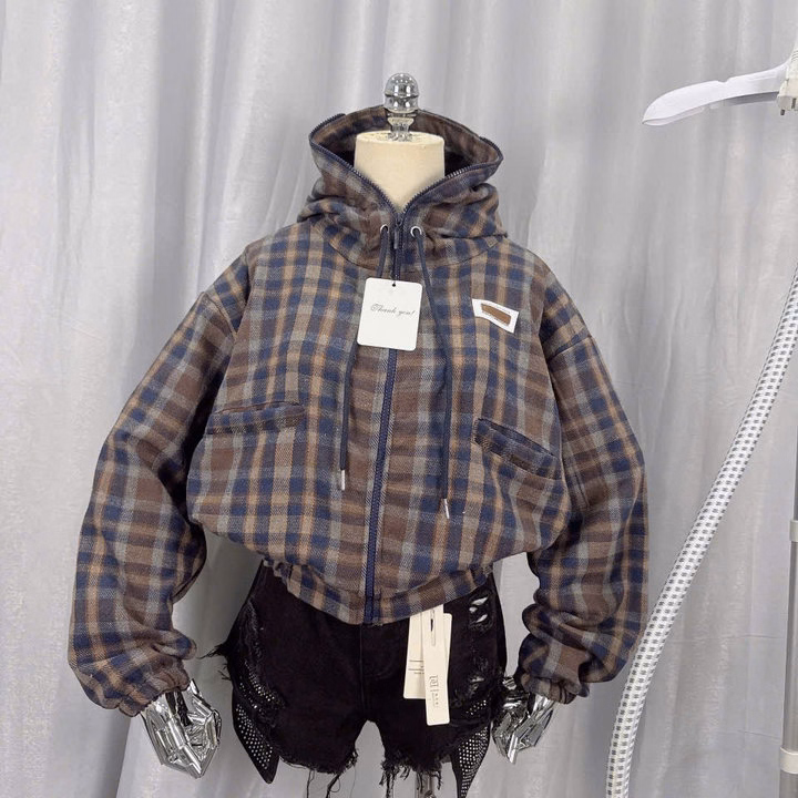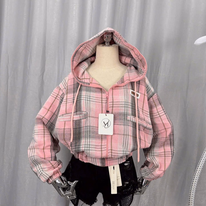 Áo Khoác Nữ Khoá Kéo Phối Caro Dáng Lửng , Cổ Cao Nón Rộng Siêu To Mẫu Mới Thời Trang Tp