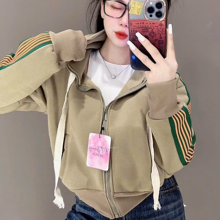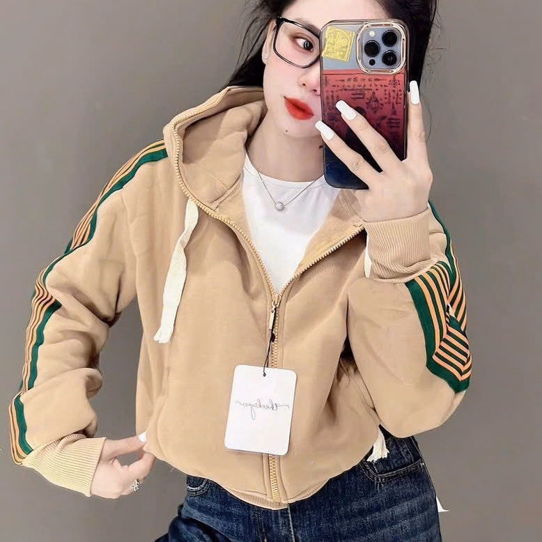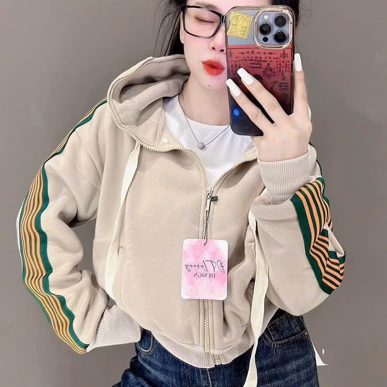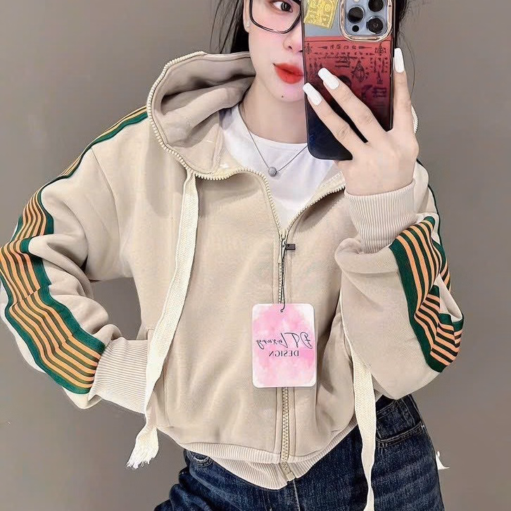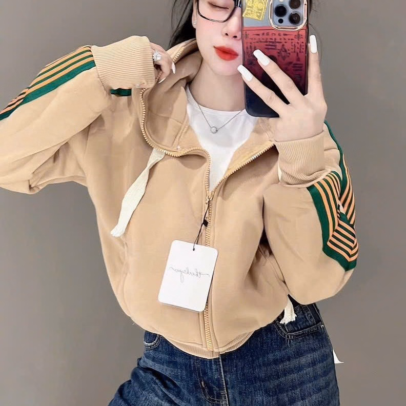 Áo Khoác Dây Kéo Vải Nỉ Phối Sọc Thân In Nổi Chữ Ở Mũ, Có Túi Trong Rộng Tp60 – Golden Dream