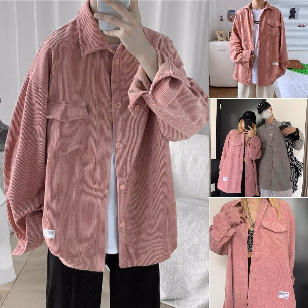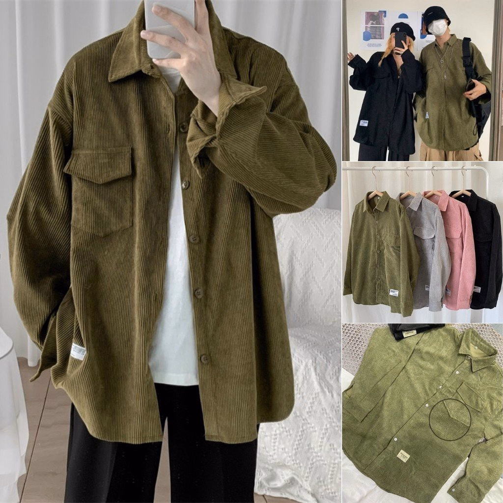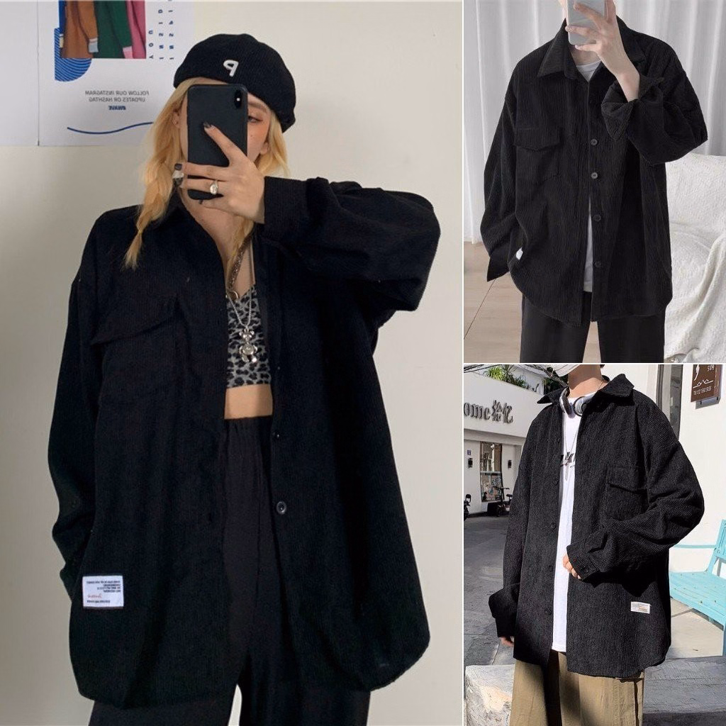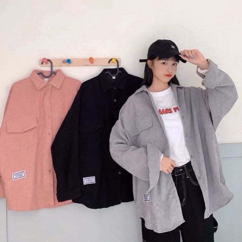 Áo Khoác Sơ Mi Nhung Tăm Gắn Logo Nam Nữ Kiểu Basic Dài Tay, Áo Oversize