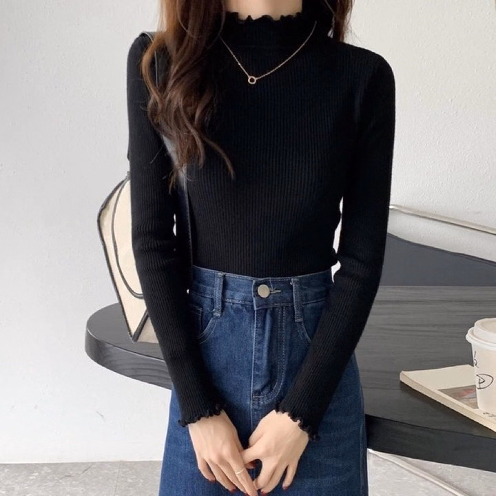 Áo Len Dài Tay Cổ Cao 3cm, Viền Sóng Mềm Mại Nhẹ Nhàng Dành Cho Bạn Nữ