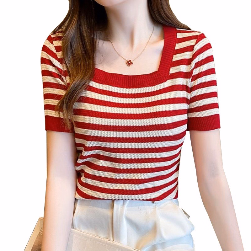 Áo Len Montoghi Cổ Vuông Họa Tiết Kẻ Ngang