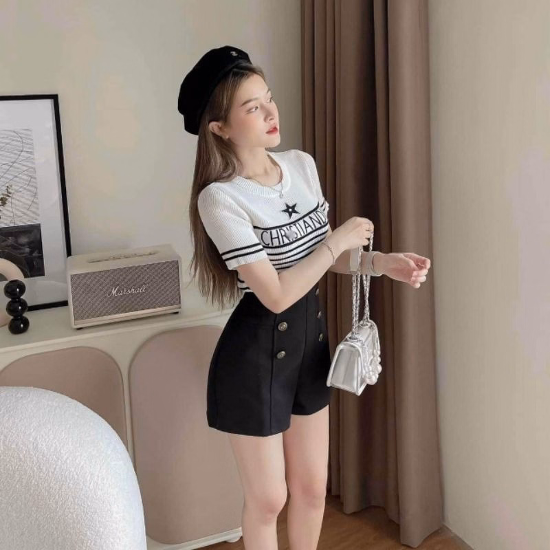 – Áo được thiết kế dáng ngắn, ôm với điểm nhấn là họa tiết kẻ sọc kết hợp với ngôi sao in chữ giữa áo
