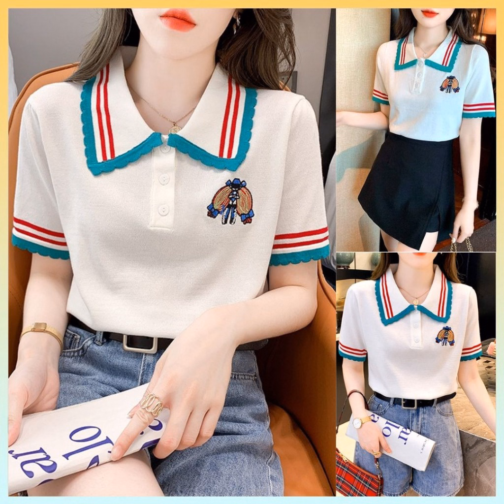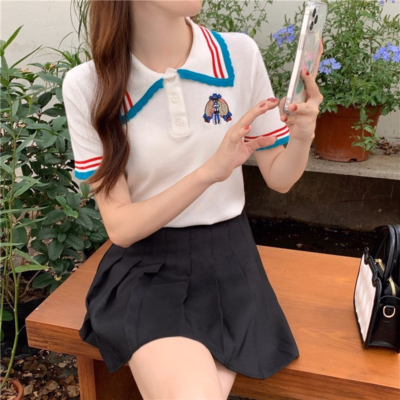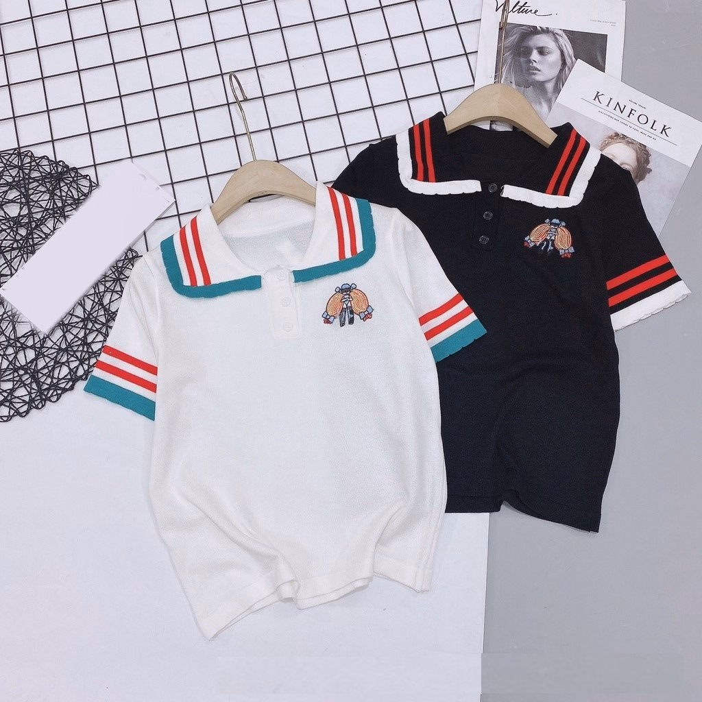Áo Len Ngắn Tay Viền Cổ Viền Tay Thêu Hình Cô Gái