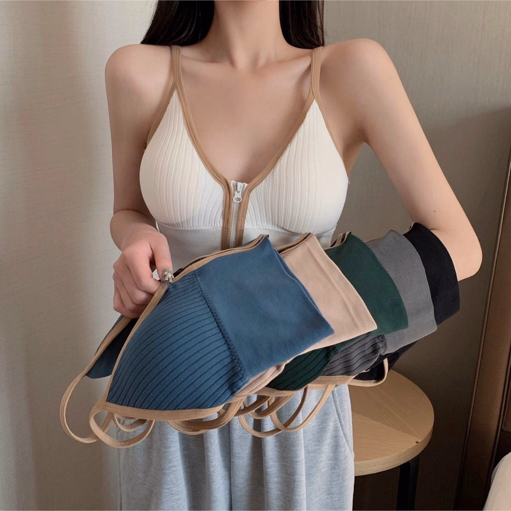 Áo Ngực Gân Nữ Cá Tính 2 Dây Cổ V Khóa Kéo Trước Croptop – Vanass