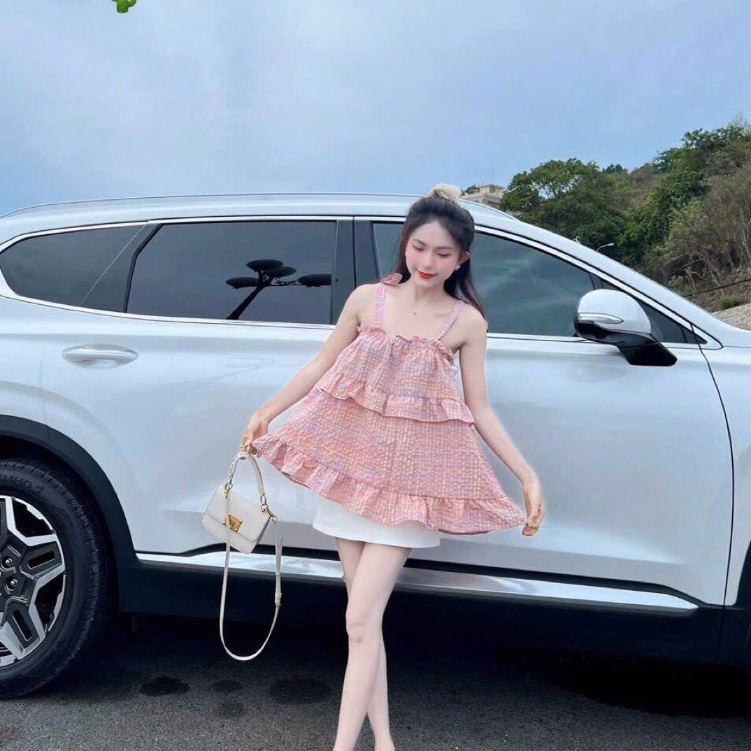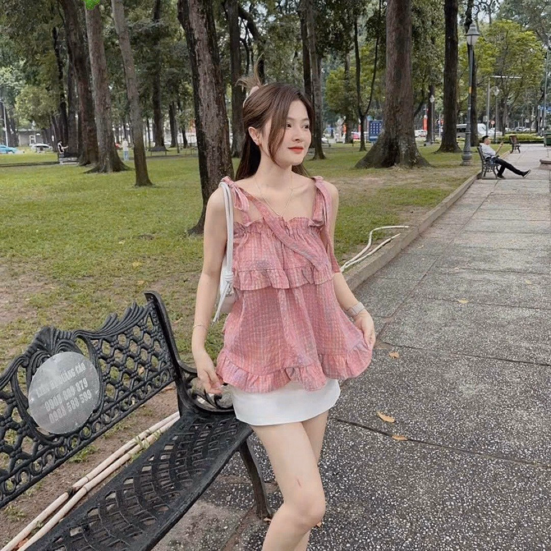 Áo Nữ 2 Dây Cột Nơ Bèo 2 Tầng Caro Hồng – Ausa House