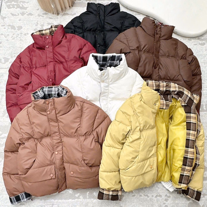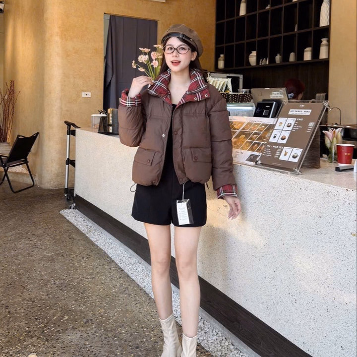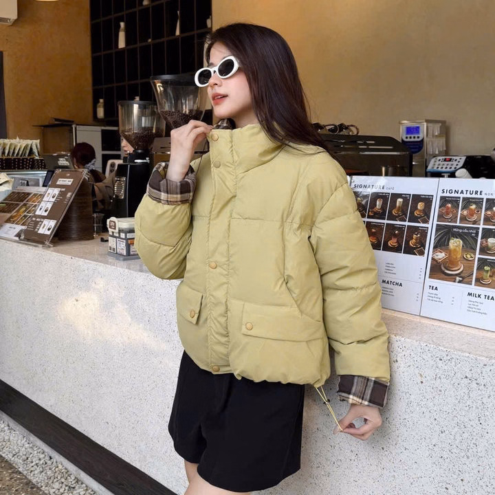 Áo Phao Da Cổ Trụ Phối Kẻ