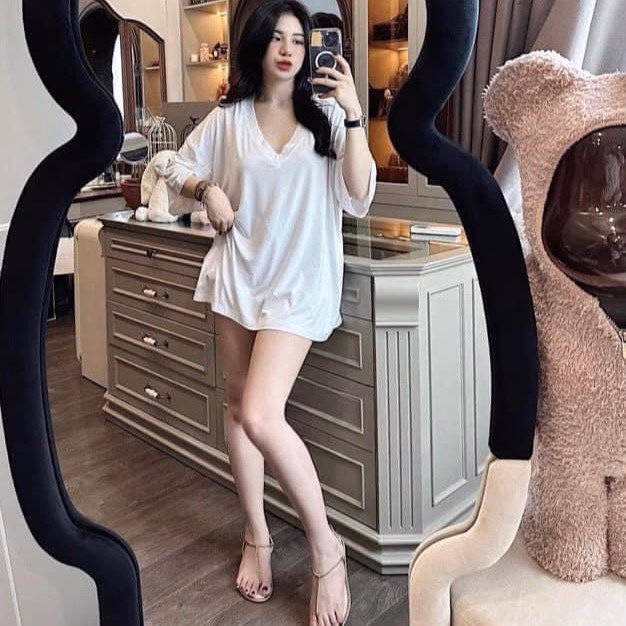 ( Lưu Ý Chất Su Mỏng Mát ) Áo Phông Form Rộng Tay Lỡ Chất Vải Cotton , Áo Cổ Tròn Nam Nữ Unisex – Hình Cô Gái Mặc Yếm