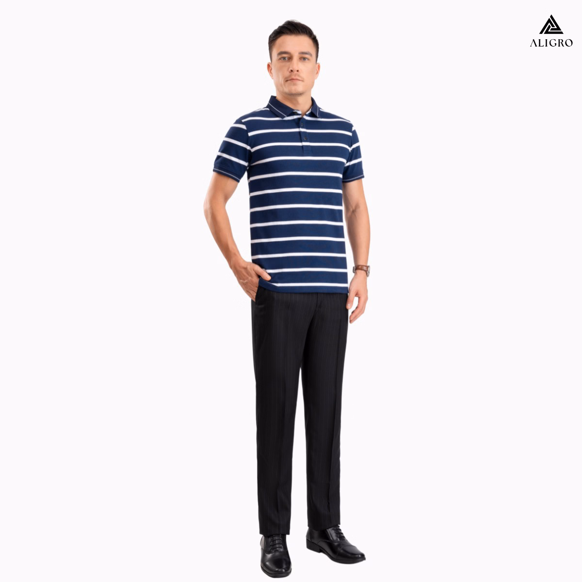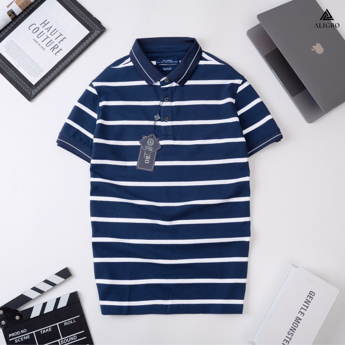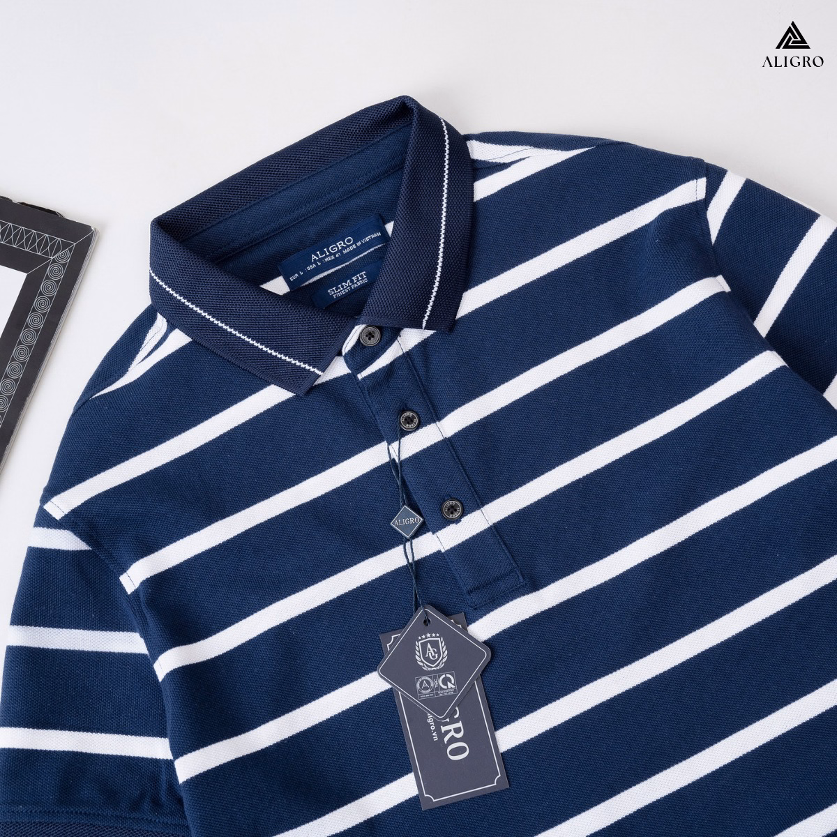 Áo Polo Nam Ngắn Tay Kẻ Ngang Navy-Trắng Algplo98- Aligro