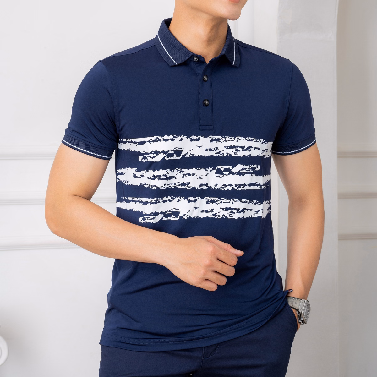 Áo Polo Nam Ngắn Tay Màu Navy Phối Kẻ Ngang Ngực Algplo72 – Aligro