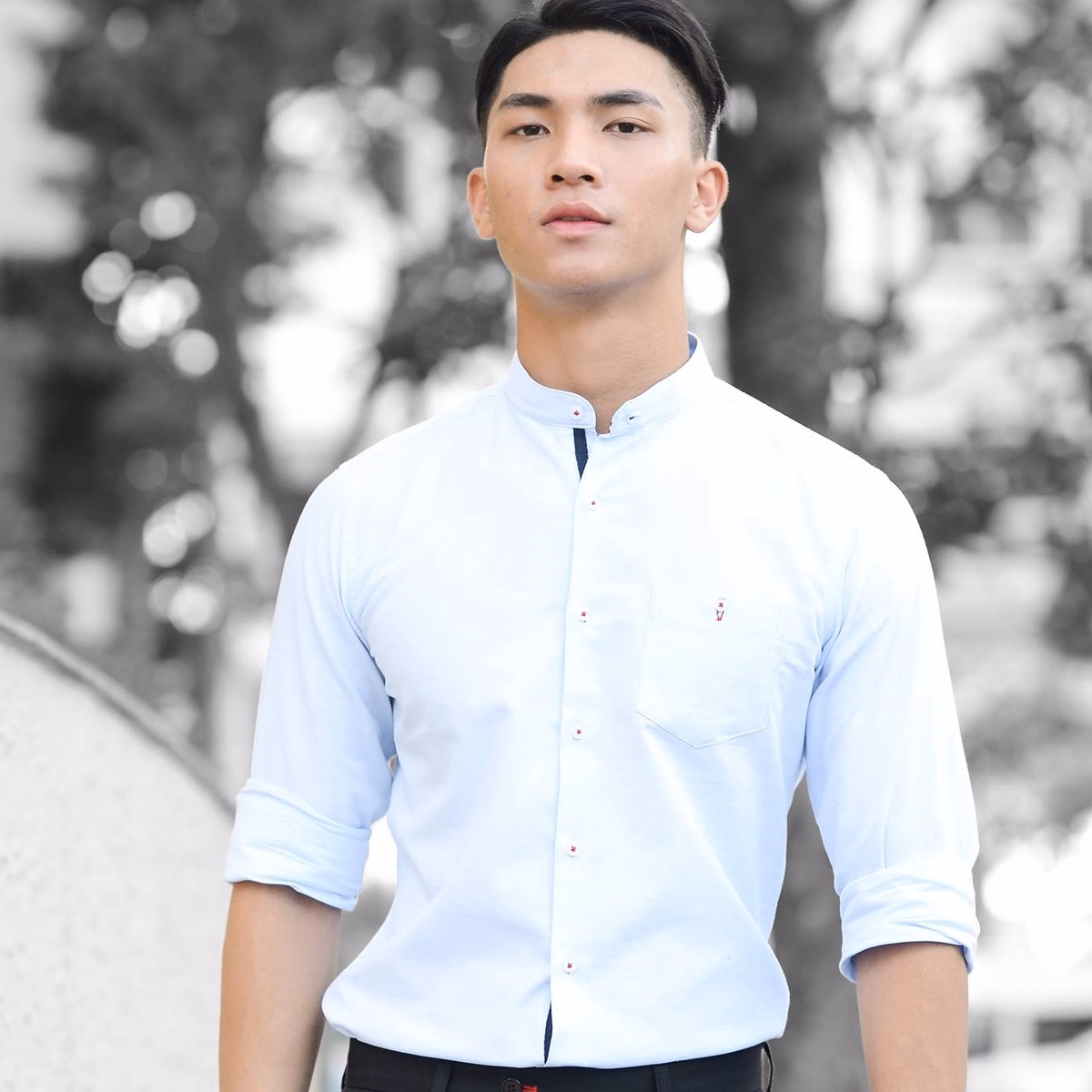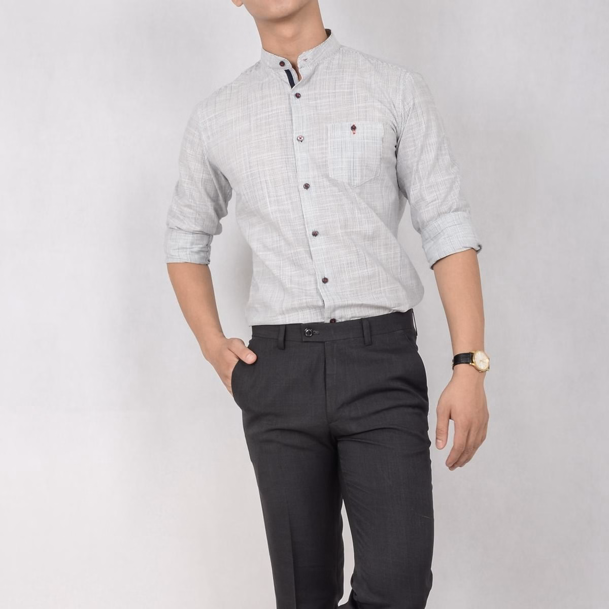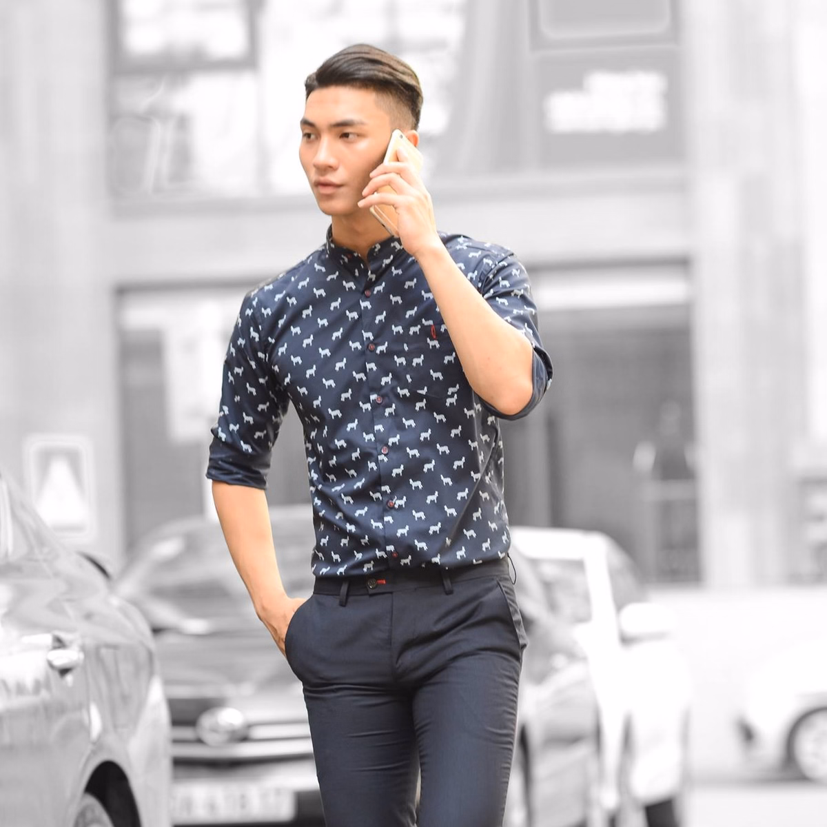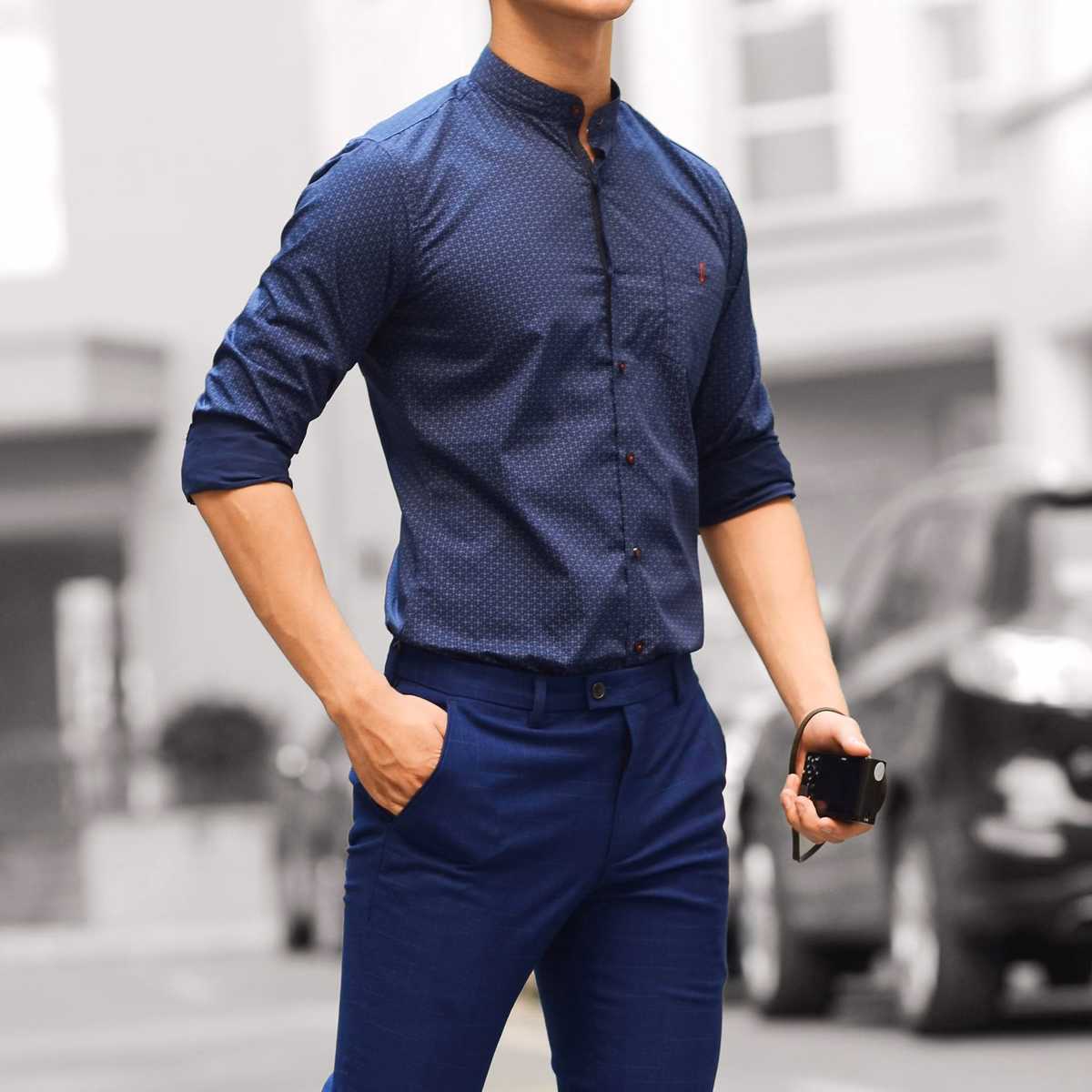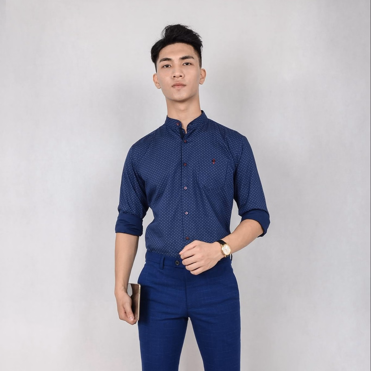 ● Kiểu dáng : Slim fit dáng ôm, cổ tàu, tay dài. Khuy cúc cổ điển.