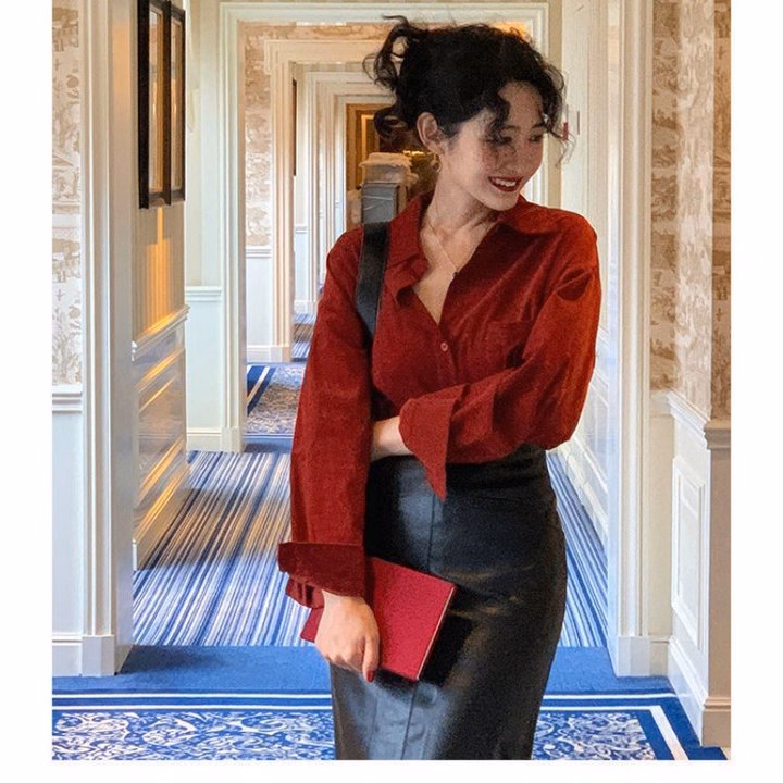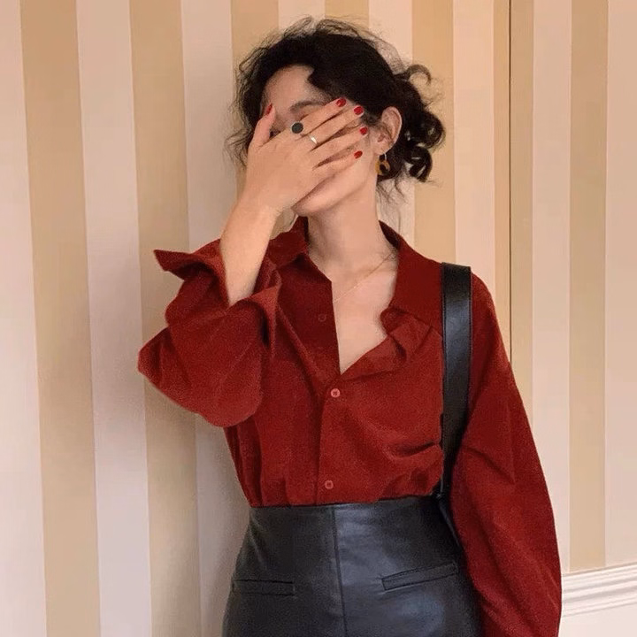 Áo Sơ Mi Dài Tay Chất Liệu Tăm Dày Dặn, Màu Đỏ Hot Trend Dành Cho Bạn Nữ