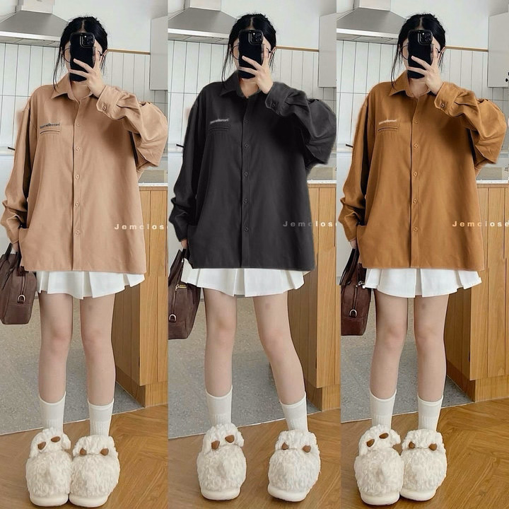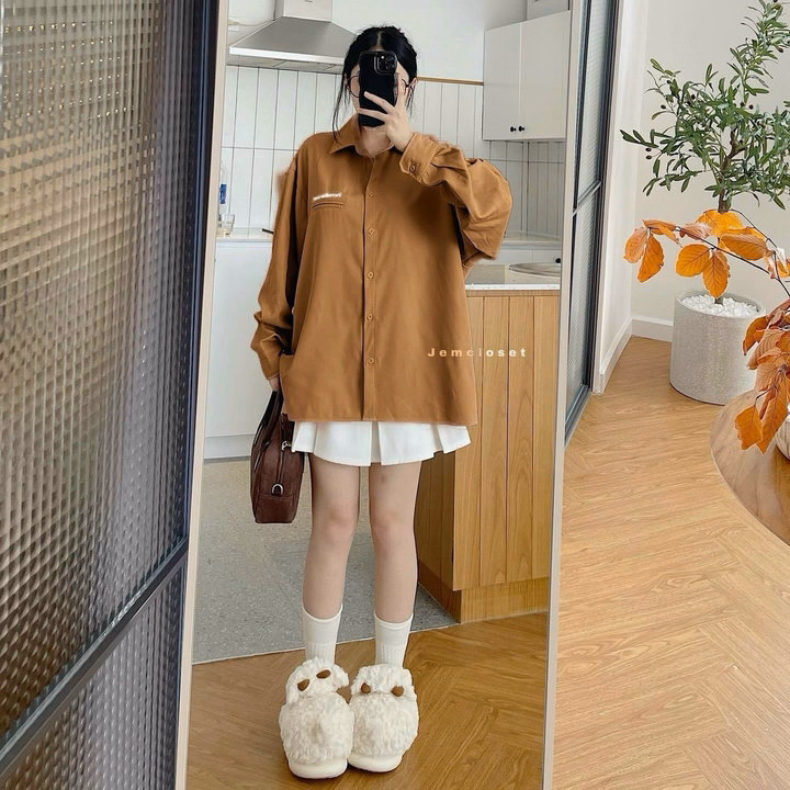 Tên sản phẩm: Áo Sơ Mi Unisex Nam Nữ Chất Vải Da Lộn Form Rộng Thêu Chữ Ở Ngực Đơn Giản Mà Đẹp Tp62 – Golden Dream