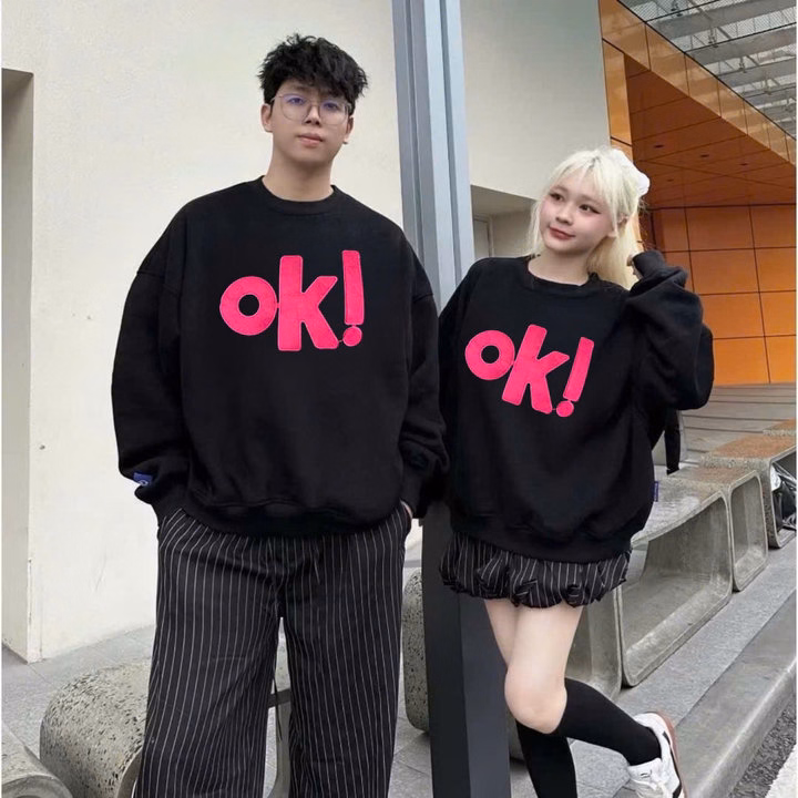 Tên sản phẩm: Áo Sweater Cặp Đôi Vải Nỉ Dày Dặn Bo Dài Thêu Chữ Okk Form Boxy Tay Phồng Unisex Nam Nữ M22 – Golden Dream