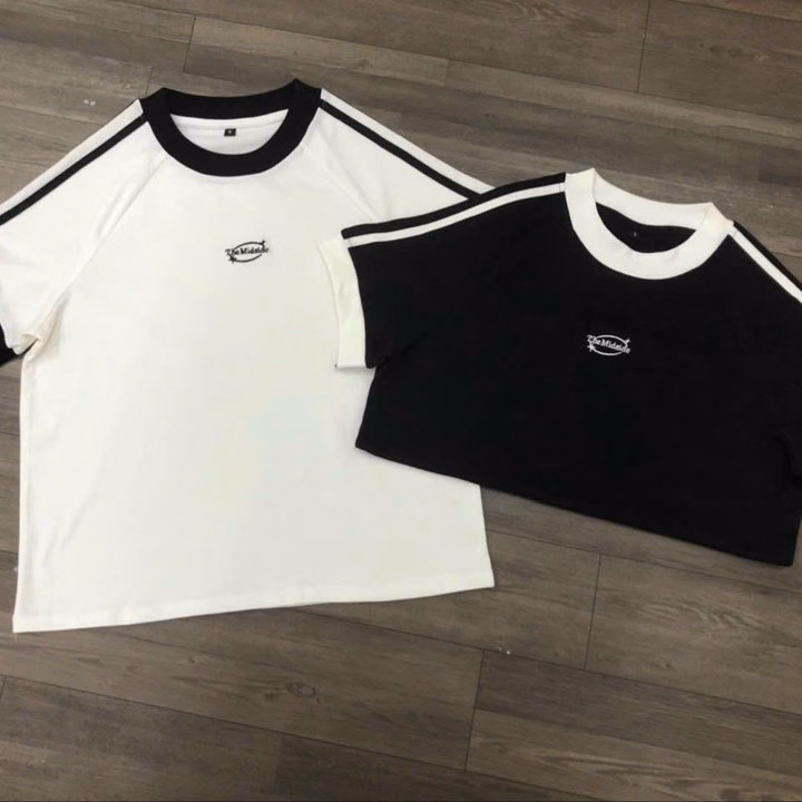 Áo Thun Cotton Nữ Cổ Tròn Phối Tay Sọc Logo In Chữ B Trước Ngực Chất Vải Co Giãn Thoáng Mát -Htm Fashion